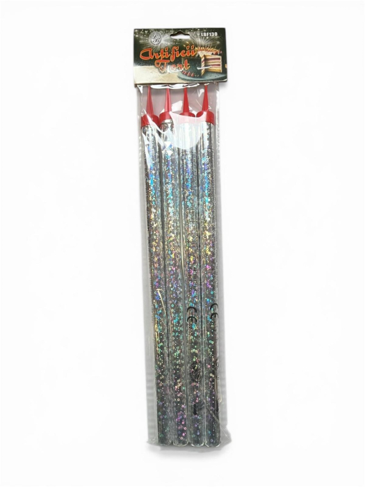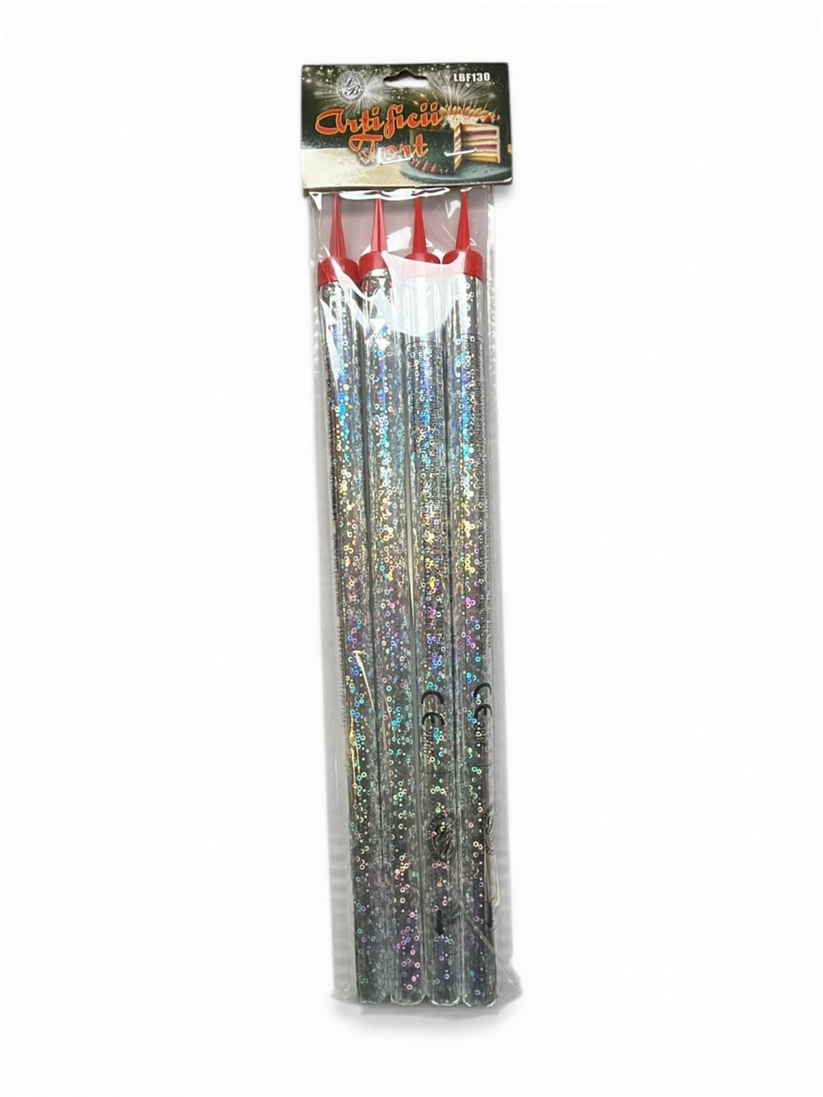 Set de 4 artificii pentru tort cu dimensiunea de 30 cm. Timpul de ardere este de aproximativ 120 secunde. Ideale pentru evenimente! Mod de utilizare: capatul de plastic se monteaza si se aprinde capatul liber. Articol pirotehnic de divertisment categoria 1. Produs interzis consumatorilor sub 16 ani. Se aprinde cu un chibrit cu mana intinsa, de la o distanta de siguranta si departe de obiecte inflamabile. Asigurati-va ca dupa folosire nu se poate reaprinde. Depozitare: intre -15/+40 grade C..