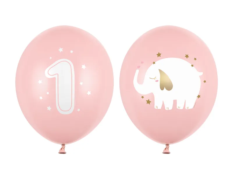Baloane rezistente cu imprimeu de un an, setul conține 2 modele: pastel în culoarea roz bebeluș cu imprimeu colorat și pastel în culoarea roz bebeluș cu imprimeu alb, diametru aprox. 30 cm.