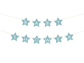 Banner în formă de stea cu inscripția „Baby Shower”, realizat din hârtie albastru deschis, dimensiunile șnurului sunt aprox. 3m.