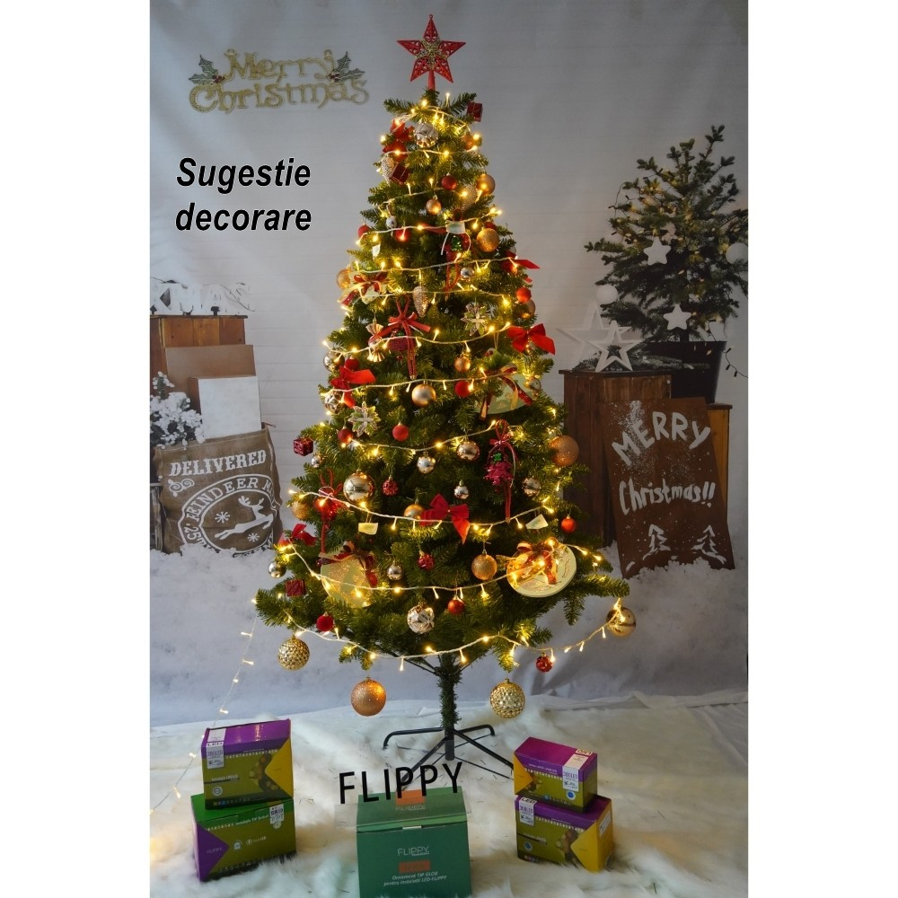 Brad artificial de Craciun, clasic, pentru interior/exterior, inaltime 210 cm, diametru 125 cm, 957 ramuri, Flippy, verde, suport metalic inclus
