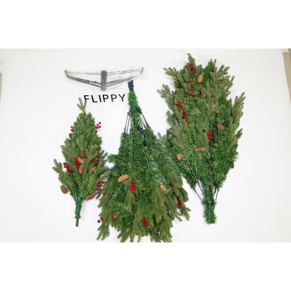 Brad artificial de Craciun, decorat cu conuri pin rosii, inaltime 150 cm, diametru 68 cm, 506 ramuri, Flippy, verde, suport metalic inclus