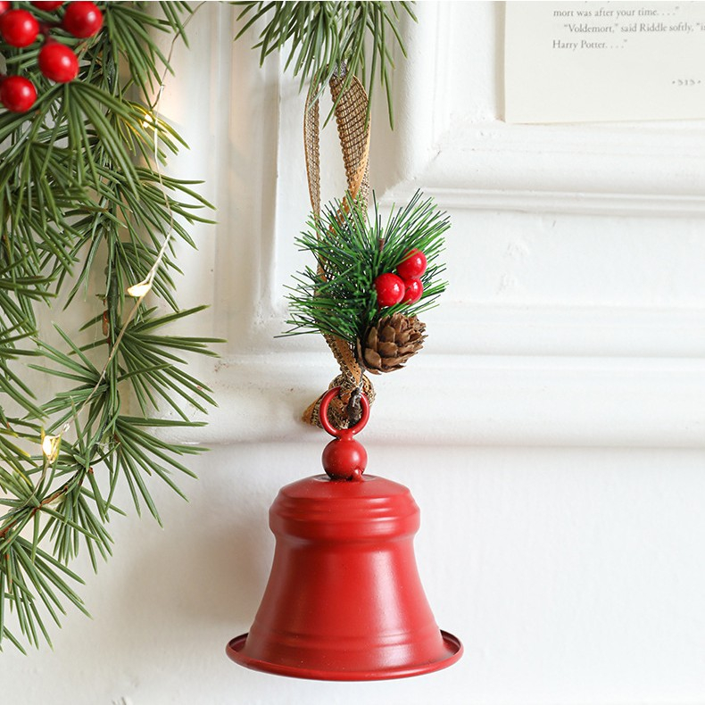 Clopot decorativ pentru Brad Craciun, Flippy, Clopot din Metal cu Funda si Crenguta de Brad pentru Decoratiune de Craciun, 10 x 8 x 8 cm, Rosu