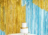 Cortină de petrecere de culoare aurie, lățime aproximativ 90 de centimetri, înălțime aproximativ 250 de centimetri.