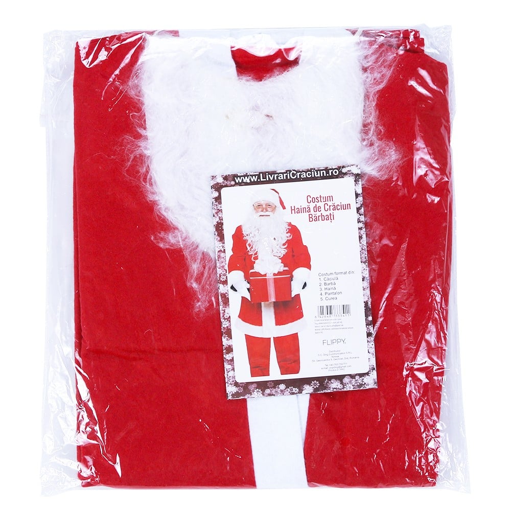 Flippy va propune: Costum Craciun Barbati, Flippy, Mos Craciun, rosu, 100% Poliester, compus din 5 piese : caciulita, barba, curea, pantaloni, haina.
