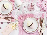 Cutii de popcorn roz deschis cu buline aurii, dimensiuni după asamblare aprox. 7 x 7 x 12,5 cm.