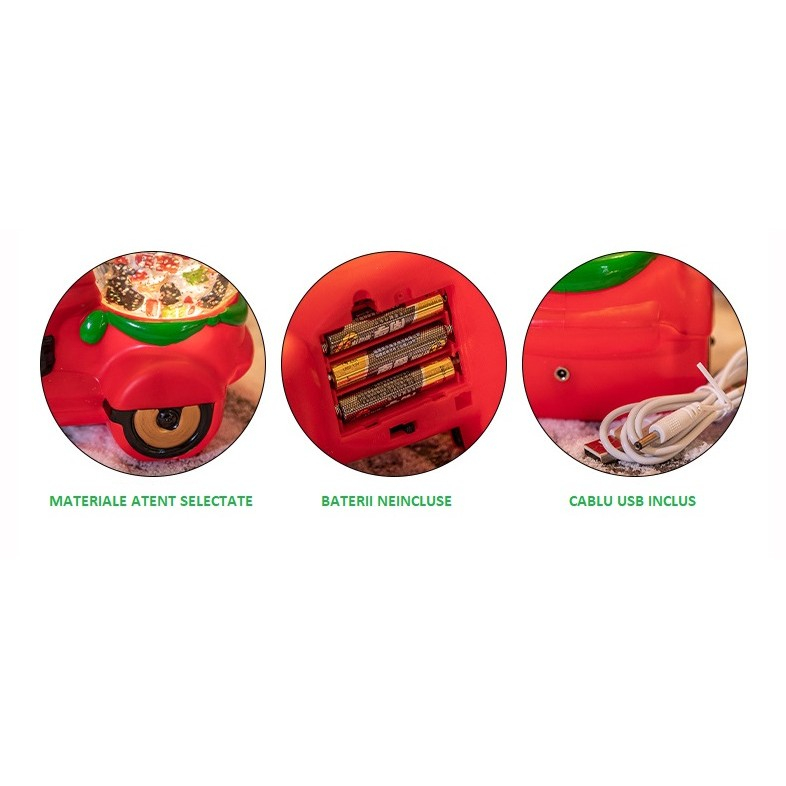 Decoratiune Craciun, Tip Motocicleta, Glob 10 cm, Figurine Mos Craciun, 3 Moduri, Functie Muzicala, Zapada in Miscare, Functioneaza Cu Baterii ( 3 x AAA neincluse), Cablu USB (Inclus), Model Rosu, 20
