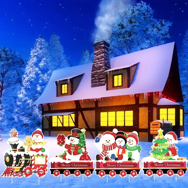 Decoratiune de Craciun, Flippy, pentru Gradina, Tip Trenulet, 4 Figurine + Bete de Infipt in Pamant, din Plastic, Impermeabil, Model Oameni de Zapada, Multicolor