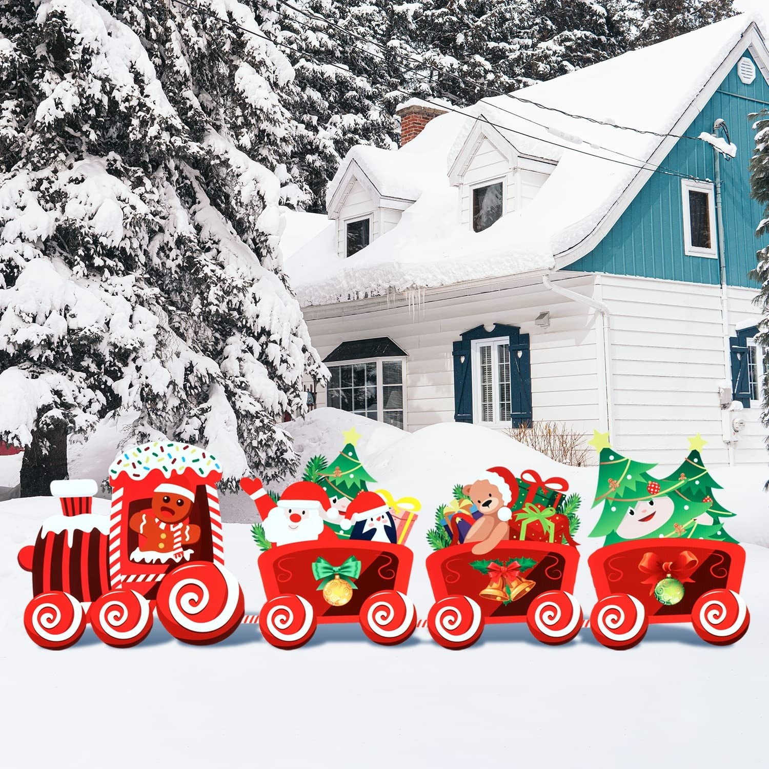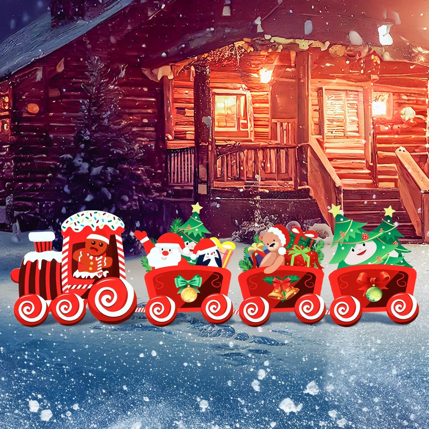 Decoratiune de Craciun, Flippy, pentru Gradina, Tip Trenulet, 4 Figurine + Bete de Infipt in Pamant, din Plastic, Impermeabil, Model Tren cu Omul Briosa in Locomotiva, Multicolor