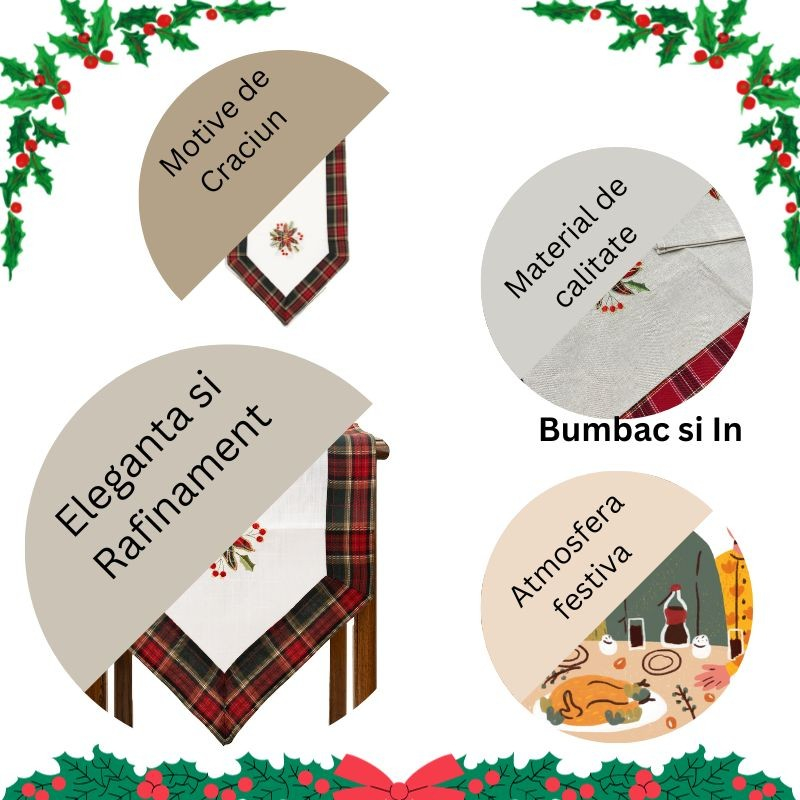 - Ambianță Festivă: Fața de masă creează o atmosferă festivă și primitoare în jurul mesei, aducând bucuria sărbătorilor la viață.