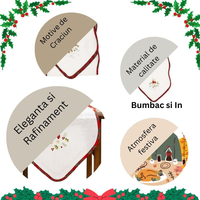 - Ambianță Festivă: Fața de masă creează o atmosferă festivă și primitoare în jurul mesei, aducând bucuria sărbătorilor la viață.