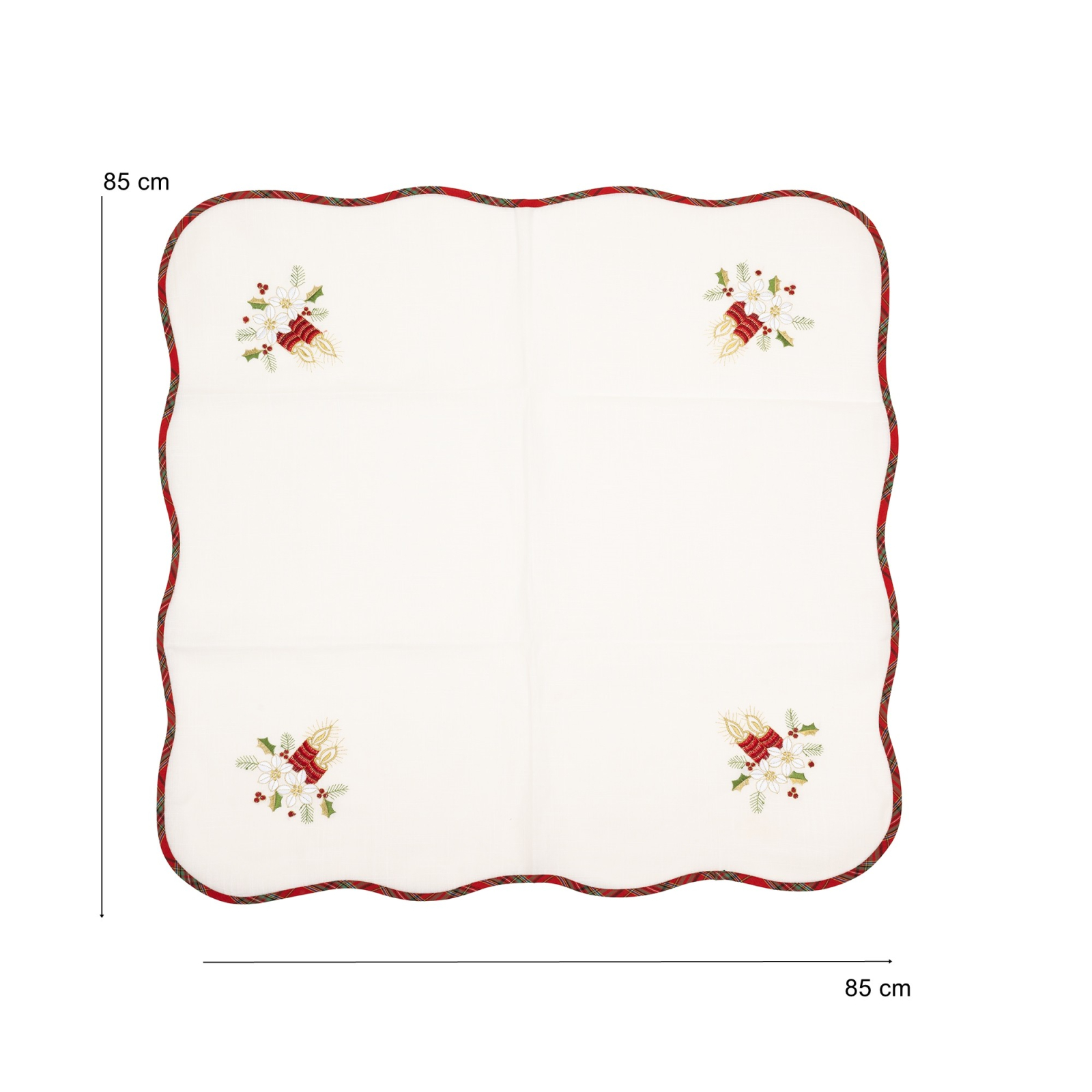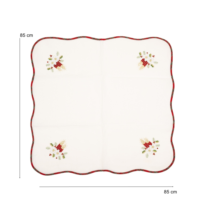 Fața de masă Flippy cu motive florale de Crăciun și lumânări adaugă o notă de eleganță și sărbătoare la orice masă festivă. Realizată din material brodat de înaltă calitate, această față de masă de 85x85 cm îmbină tradiția Crăciunului cu un design delicat de lumânări, oferind un cadru perfect pentru momentele speciale.