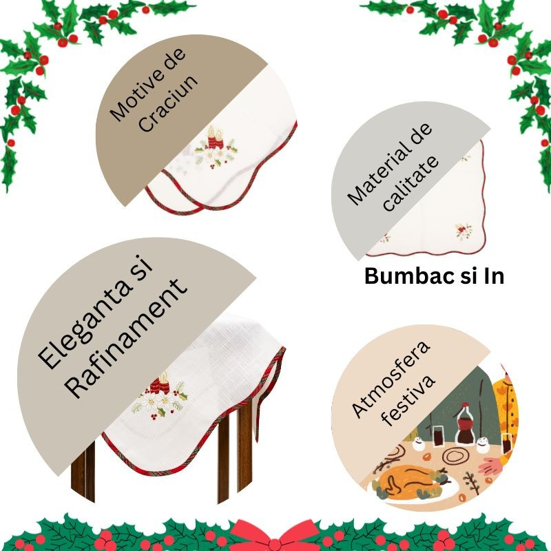 - Ambianță Festivă: Fața de masă creează o atmosferă festivă și primitoare în jurul mesei, aducând bucuria sărbătorilor la viață.