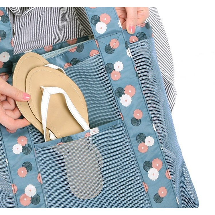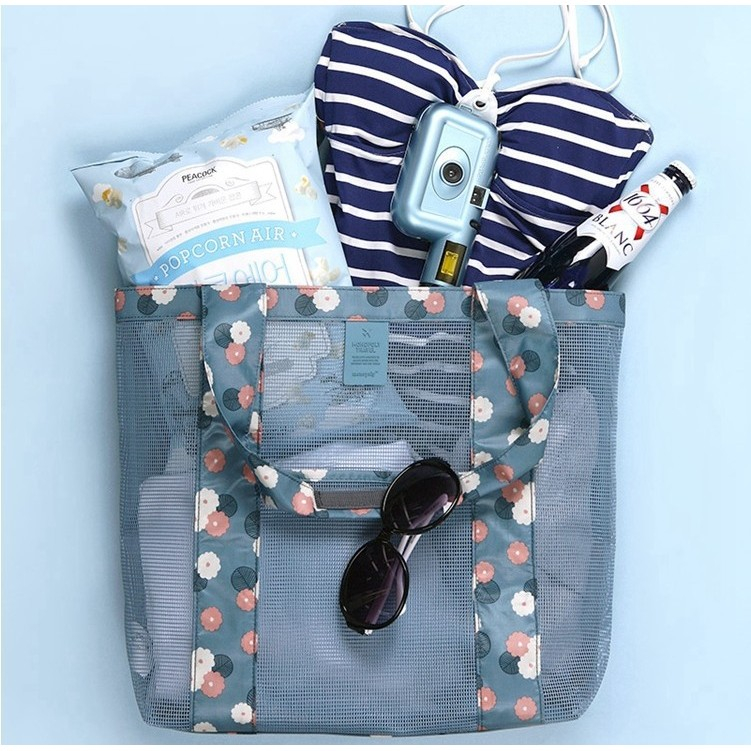 Geanta de Plaja, Flippy, din Plasa Transparenta, Imprimeu Floral, 43 x 10 x 33 cm, Model pentru Umar, Lungime Inferioara 33 cm, Albastru