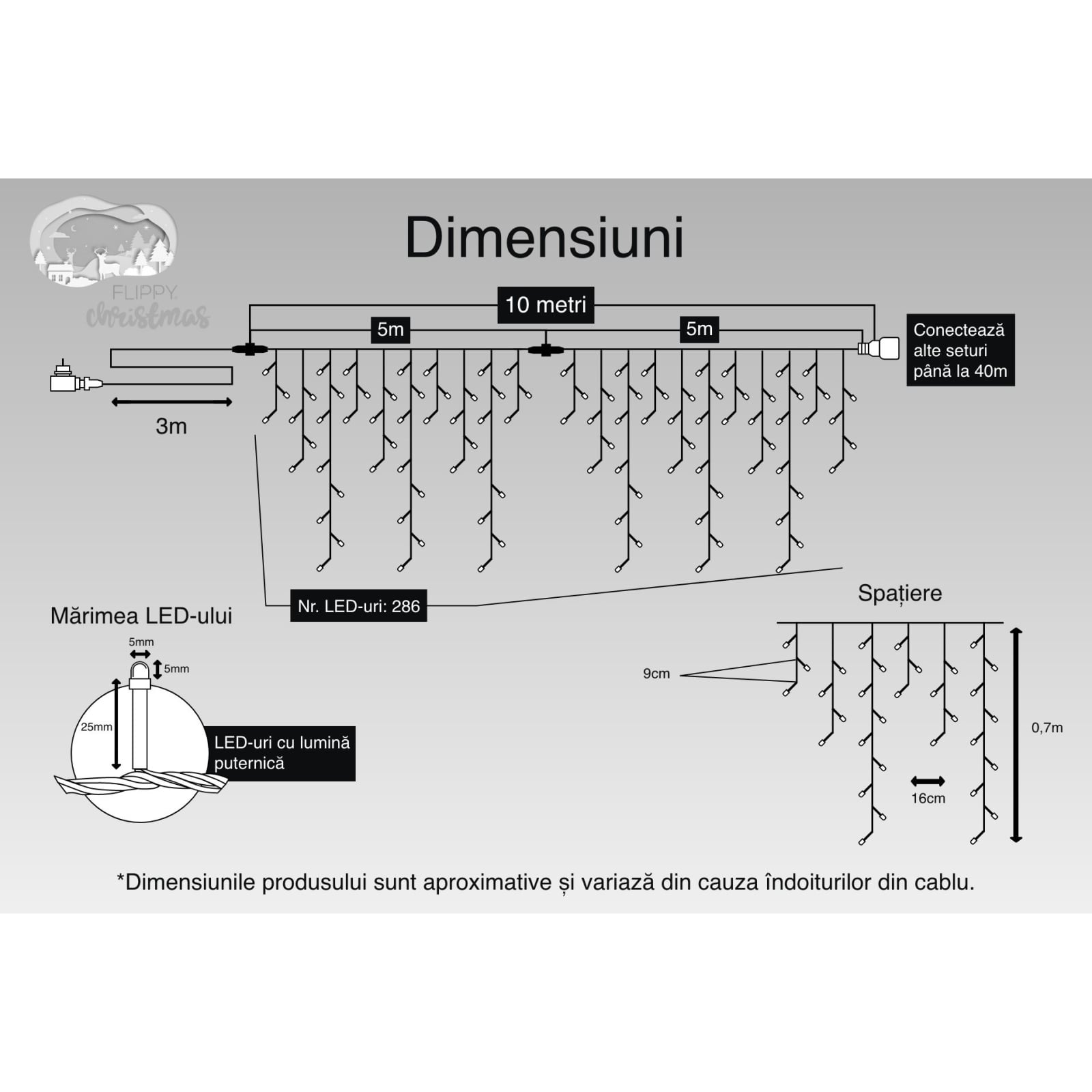 Instalatie Craciun, 10 m, 286 Led-uri ,Franjuri, Rosu / Verde/ Albastru, Flash, Transformator, Interconectabila, Prelungitor 3 m inclus, Fir Alb, Flippy