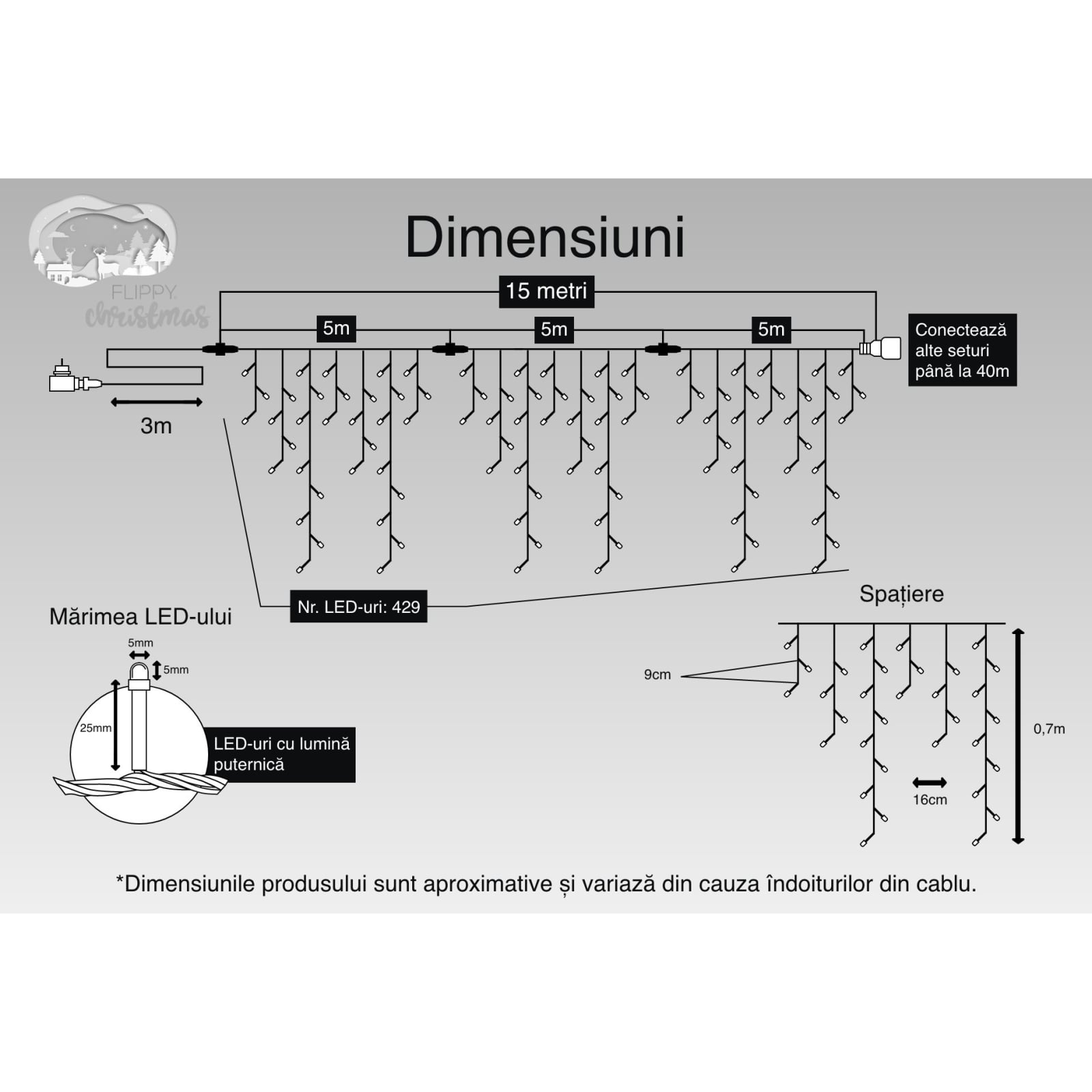 Instalatie Craciun, 15 m, 429 Led-uri ,Franjuri, Rosu / Verde/ Albastru, Flash, Transformator cu telecomanda, Interconectabila, Prelungitor 3 m inclus, Fir Alb, Flippy