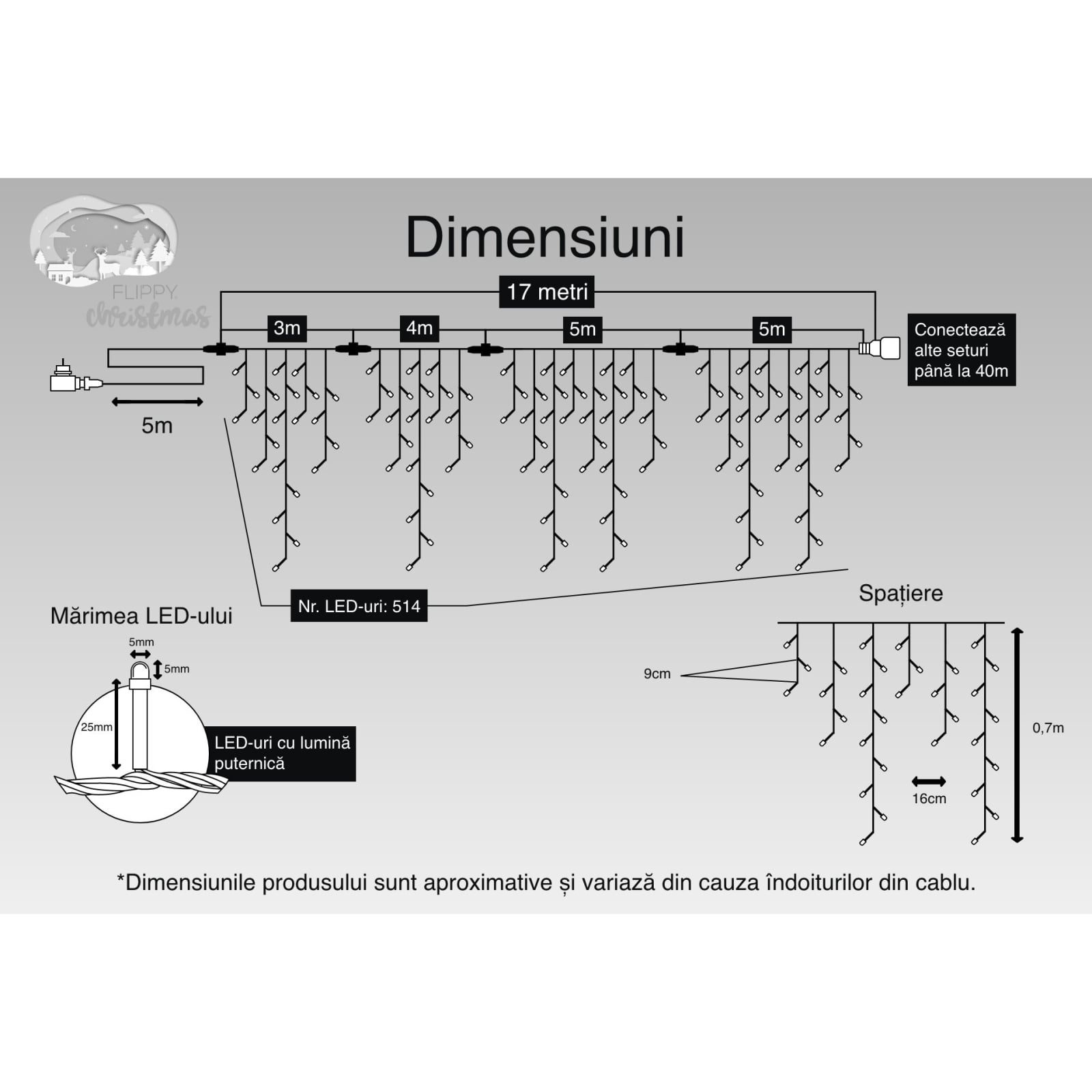 Suprafata luminoasa are un total de 17 m metri. Lungimea prelungitorului este de 5 m metri. Ofera posibilitatea de a suspenda ghirlanda astfel incat sa poata fi ascuns cablul de alimentare atunci cand este conectat la priza.