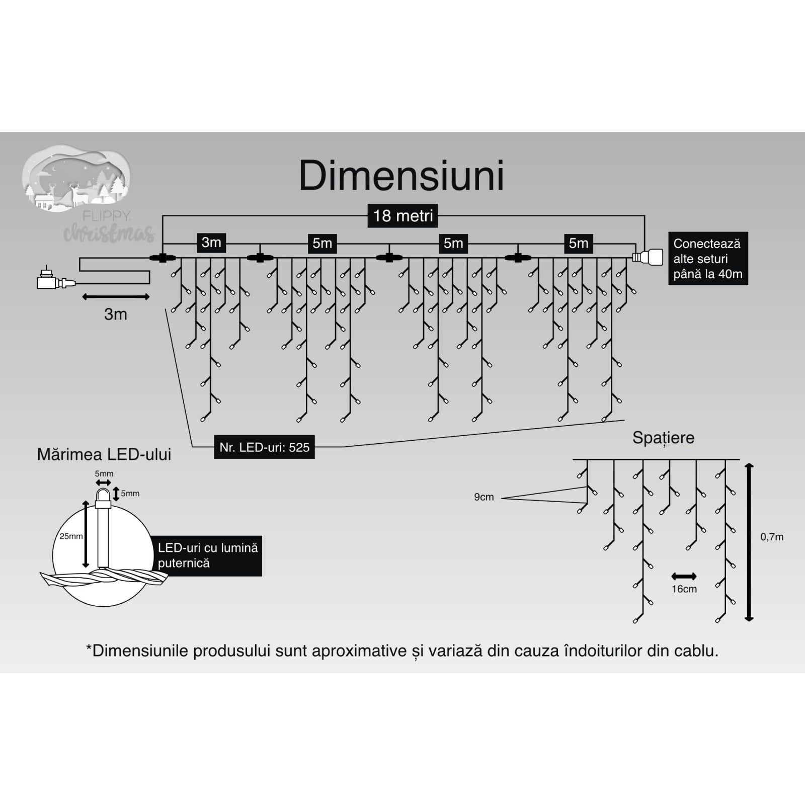 Suprafata luminoasa are un total de 18 m metri. Lungimea prelungitorului este de 3 m. Ofera posibilitatea de a suspenda ghirlanda astfel incat sa poata fi ascuns cablul de alimentare atunci cand este conectat la priza.