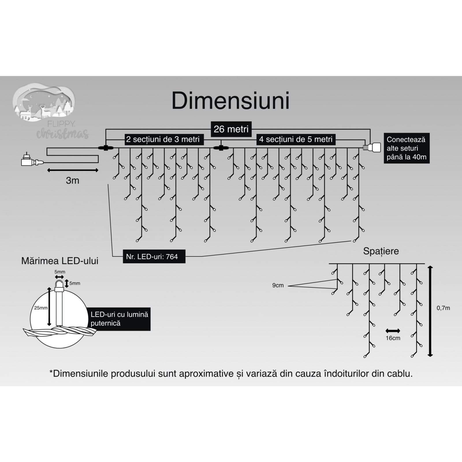 Suprafata luminoasa are un total de 26 m metri. Lungimea prelungitorului este de 3 m. Ofera posibilitatea de a suspenda ghirlanda astfel incat sa poata fi ascuns cablul de alimentare atunci cand este conectat la priza.