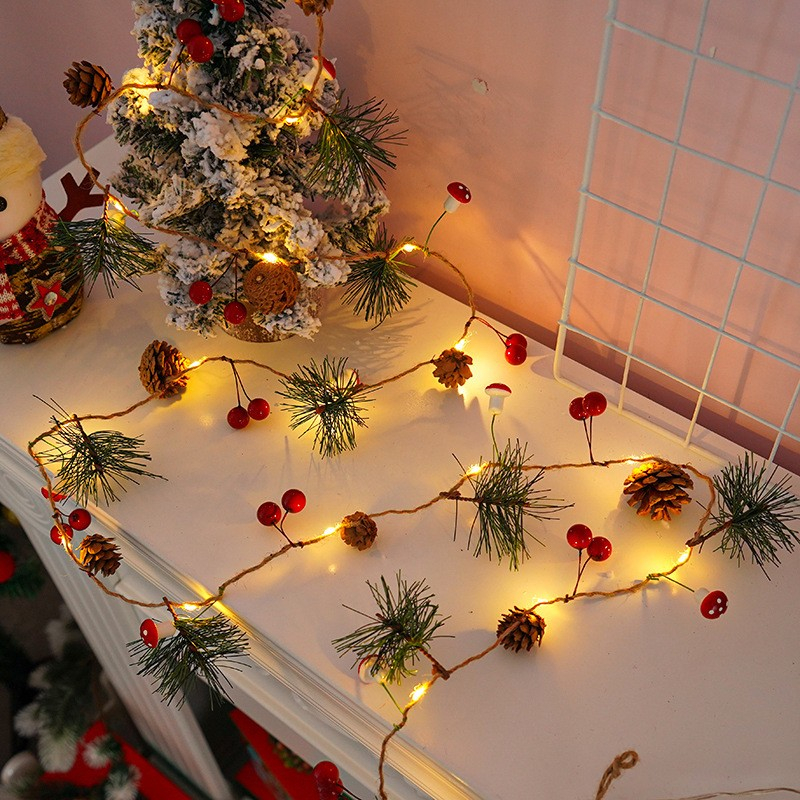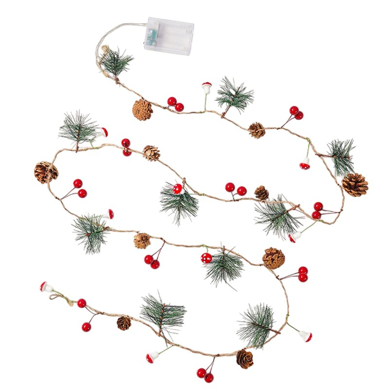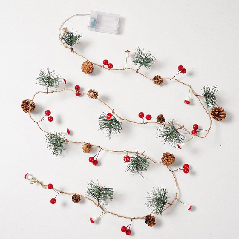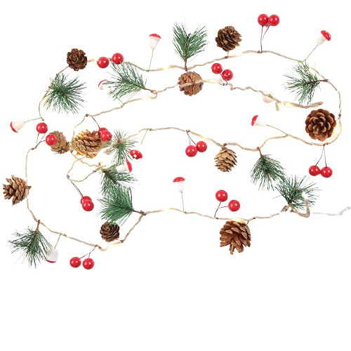 Instalatia contine 20 de becuri cu lumina LED, de culoare alb cald in forma de ace si conuri de pin si ciuperci.