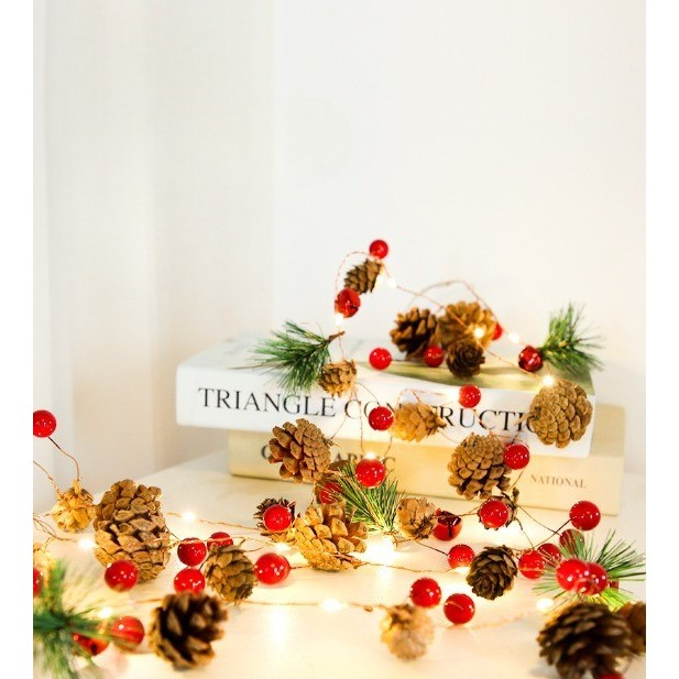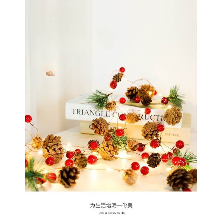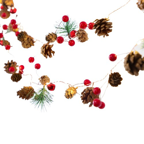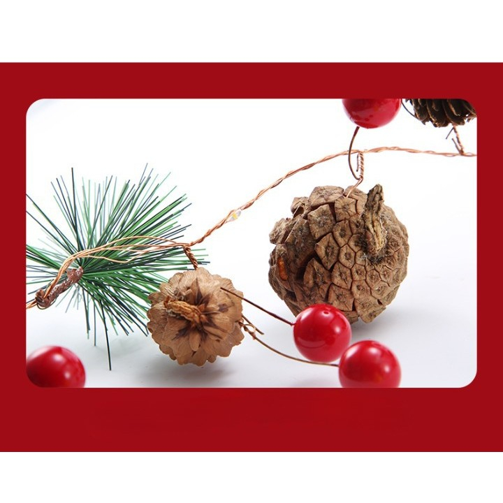 Instalatia contine 20 de becuri cu lumina LED, de culoare alb cald in forma de ace si conuri de pin si clopotei.