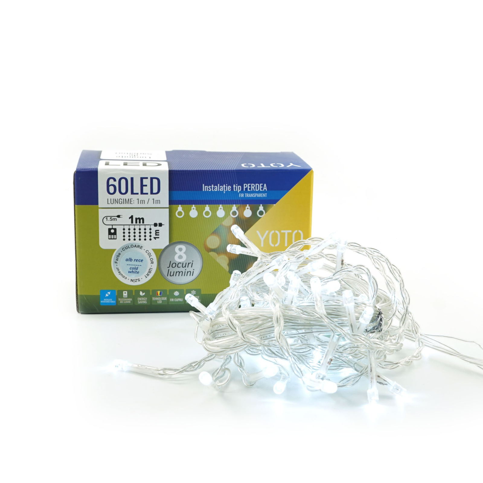 Cu dimensiunile sale impresionante de 1 metri în lungime și 1 metri înaltime, această instalație este alegerea perfectă pentru a crea o atmosferă de sărbătoare încântătoare, fie că este folosită în interior sau exterior. Cu un total de 60 de LED-uri luminoase, această perdea aduce cu sine strălucirea caldă a Crăciunului într-un mod captivant și fermecător.