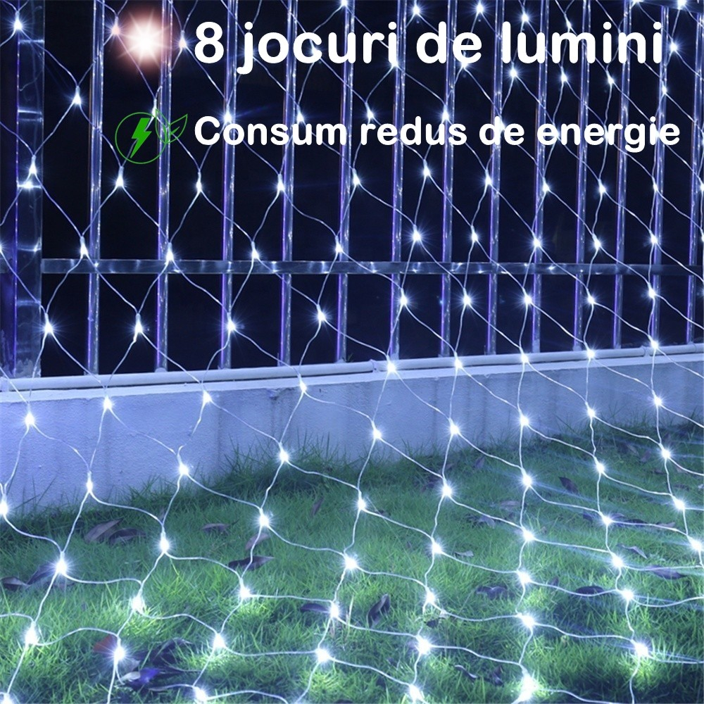 Culoare:Alb rece | Continut pachet:1 x Instalatie Craciun Yoto, Tip Plasa, 1.2 m x 1.2 m, 80 LED-uri, Prelungitor 1.5 m, 8 Jocuri de Lumini, Interconectabila, Fir transparent, Interior/Exterior, Alb Rece | Functii:Licareste