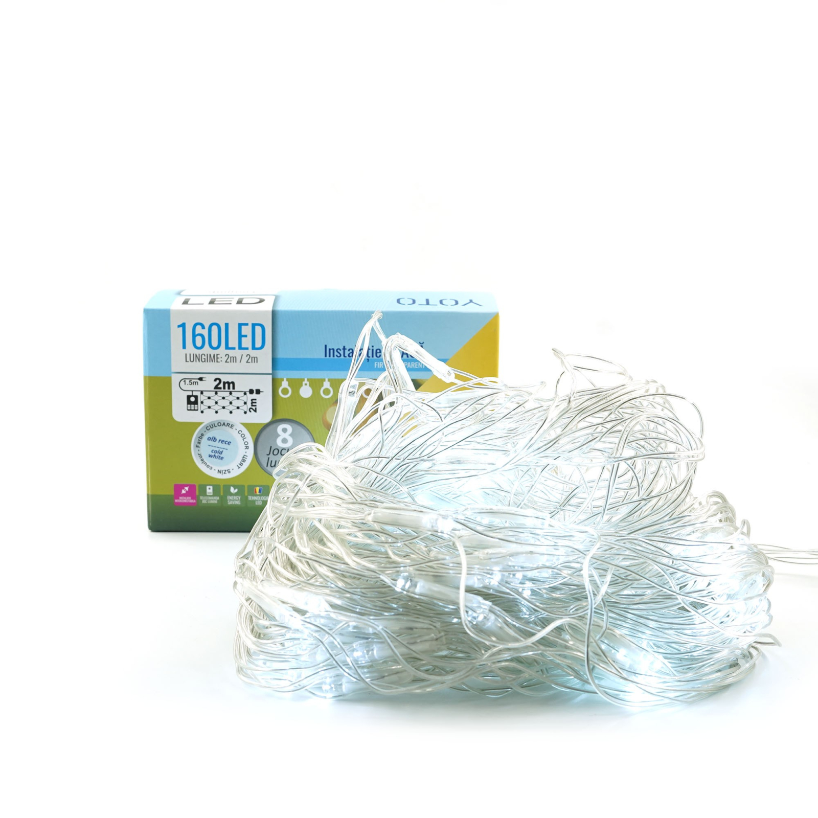 Culoare:Alb rece | Continut pachet:1 x Instalatie Craciun Yoto, Tip Plasa, 2 m x 2 m, 160 LED-uri, Prelungitor 1.5 m, 8 Jocuri de Lumini, Interconectabila, Fir transparent, Interior/Exterior, Alb Rece | Functii:Licareste