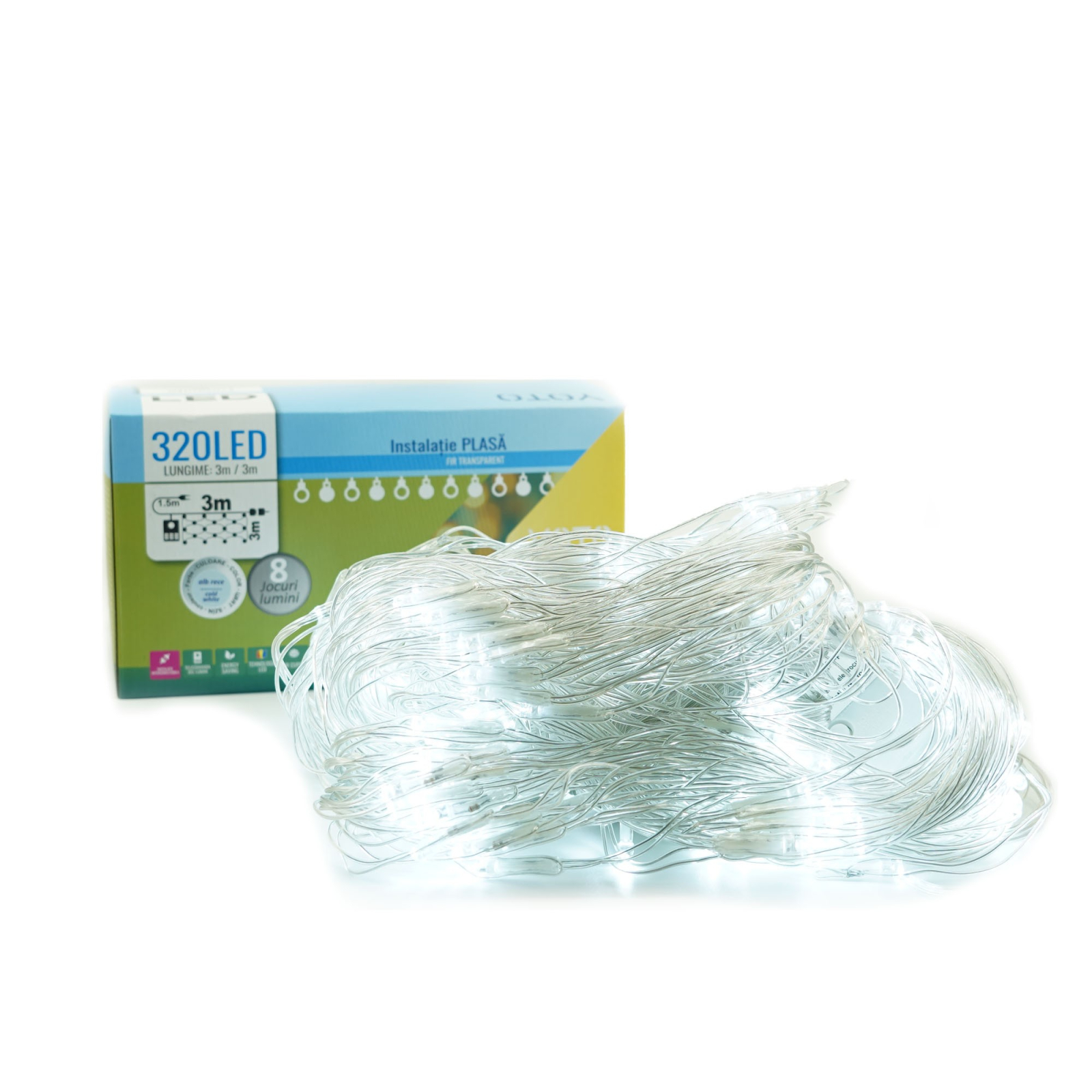 Culoare:Alb rece | Continut pachet:1 x Instalatie Craciun Yoto, Tip Plasa, 3 m x 3 m, 320 LED-uri, Prelungitor 1.5 m, 8 Jocuri de Lumini, Interconectabila, Fir transparent, Interior/Exterior, Alb Rece | Functii:Licareste