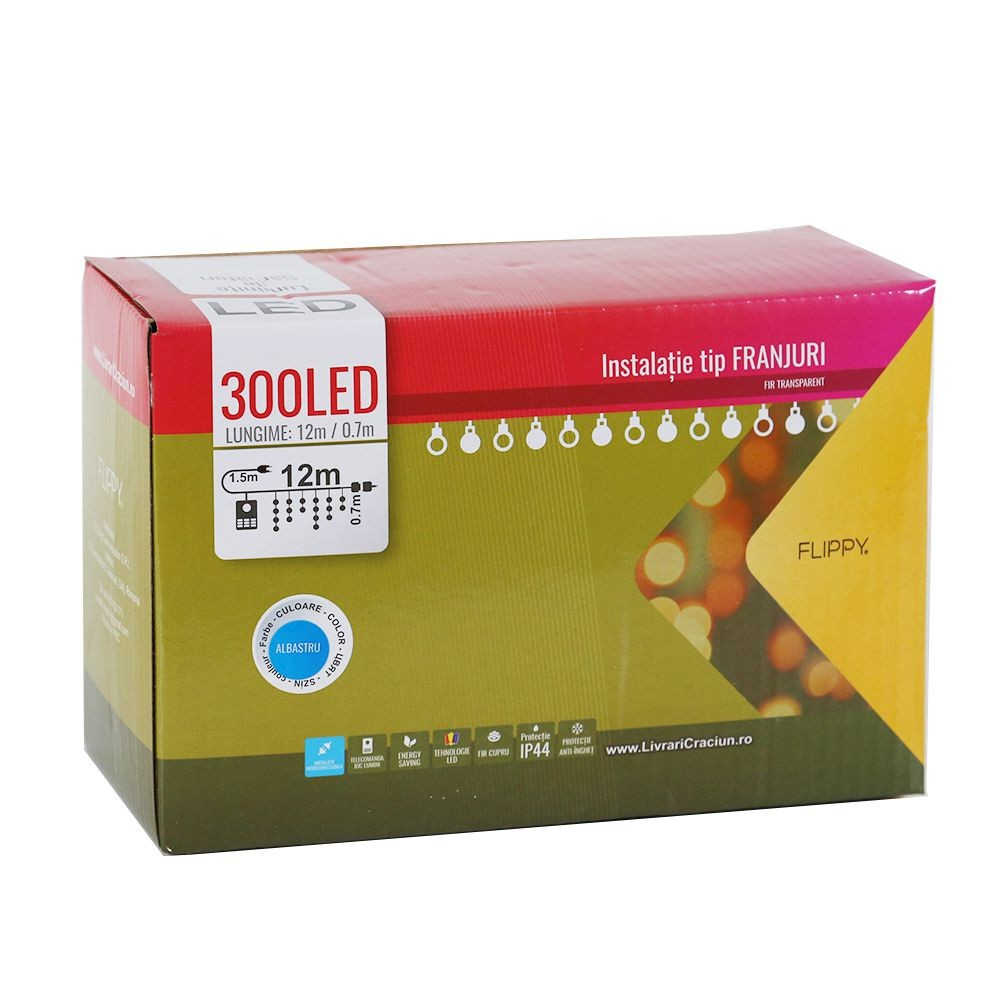 Instalatie de Craciun Flippy® Tip Franjuri, 12 m, 300 LED-uri, Interconectabila, Albastru este interconectabila, lucru ce permite conectarea mai multor instalatii in limita a 3.000 de LED-uri.