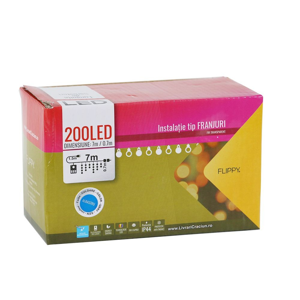1 x Instalatie de Craciun, Flippy®, Tip Franjuri, 7 m, 200 LED-uri, Interconectabila, Albastru 1 x Certificat de Garantie 1 x Manual de Instructiuni