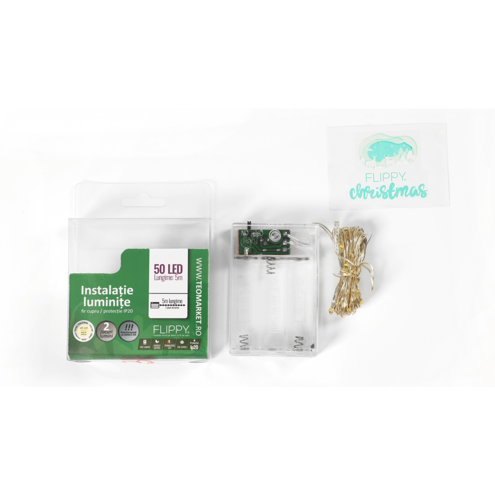 Instalatie de Craciun, Liniara, 5 m, Baterii, 50 LED-uri, Alb Cald, Fir Cupru, 2 Jocuri de Lumini, Interior/Exterior, Flippy