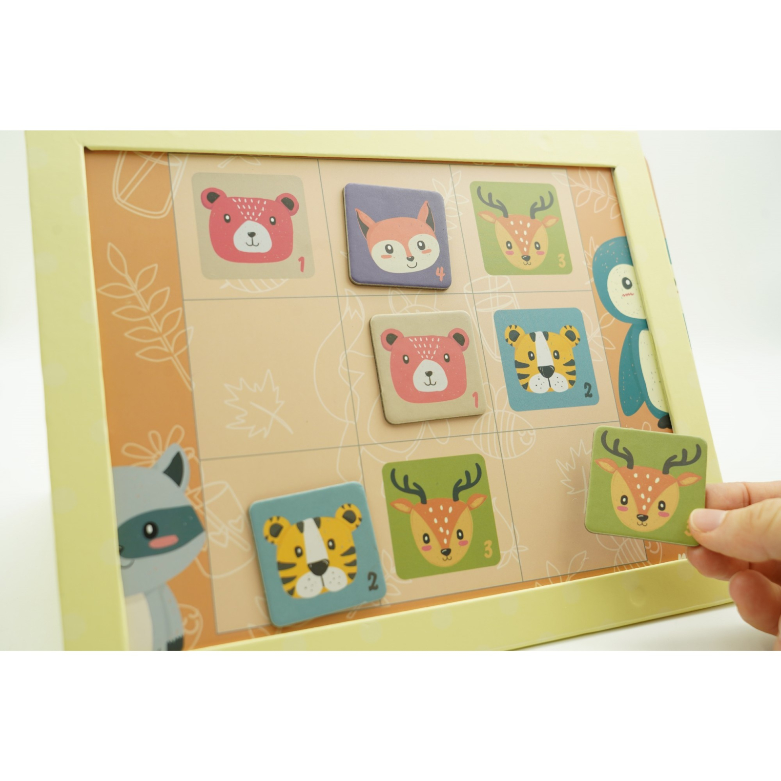 Joc educativ Sudoku cu tablita magnetica, 32 de piese, cartonase cu animale, Verde