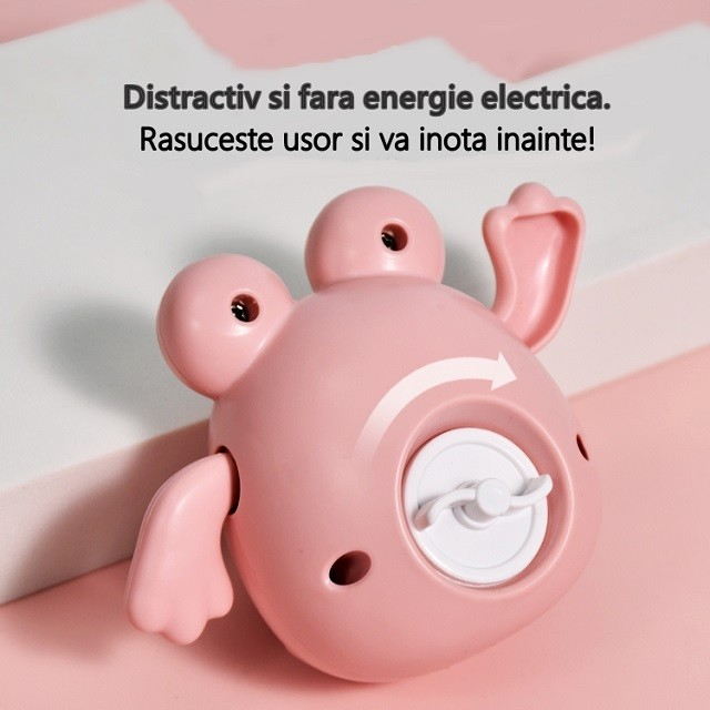 Cu o expresie ce emana pozitivitate si un sentiment placut, niste brate ce se rotesc in apa pentru a il ajuta sa parcurga distante mari si un mecanism simplu si usor de folosit ce nu include folosirea bateriilor sau al oricarei forme de electricitate, broscuta roz este cadoul perfect pentru copilul dvs! Timpul petrecut in baie nu ar trebui sa fie unul plictisitor, ci unul in care combini utilul cu placutul si te joci cu prietenii tai adorabili. Ajuta-l pe cel mic sa isi dezvolte abilitatile de coordonare mana - ochi si de distingere intre culori, sa se relaxeze si nu in ultimul rand, sa se distreze!