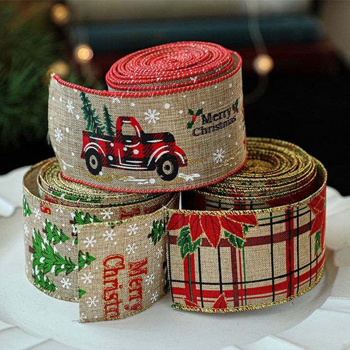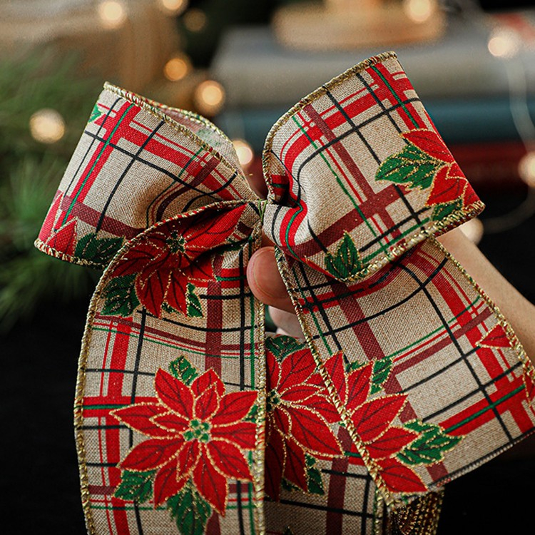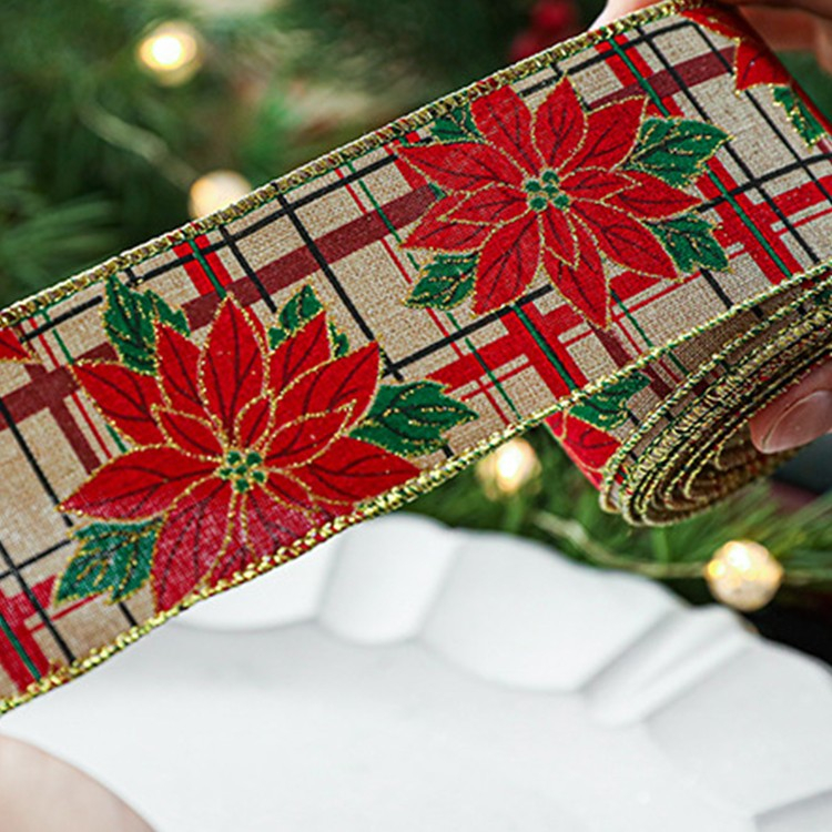 Panglica de Craciun pentru Decor Brad, Flippy, Panglica Decorativa de Craciun pentru Funde, Imprimeu Floare Rosie, 200 x 6.3 m, Khaki Rosu