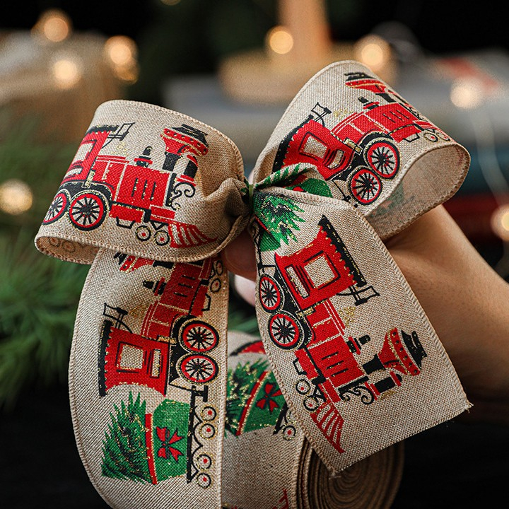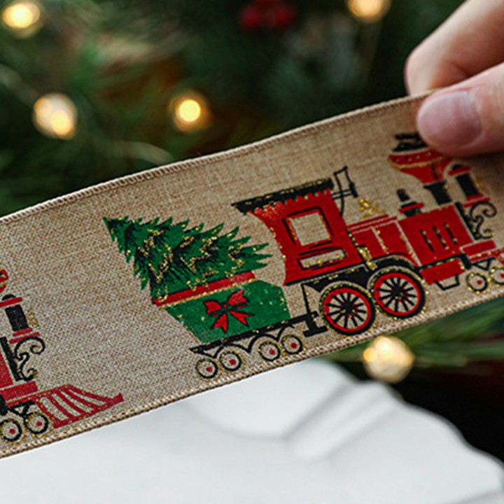 Panglica de Craciun pentru Decor Brad, Flippy, Panglica Decorativa de Craciun pentru Funde, Imprimeu Trenulet, 200 x 6.3 m, Khaki