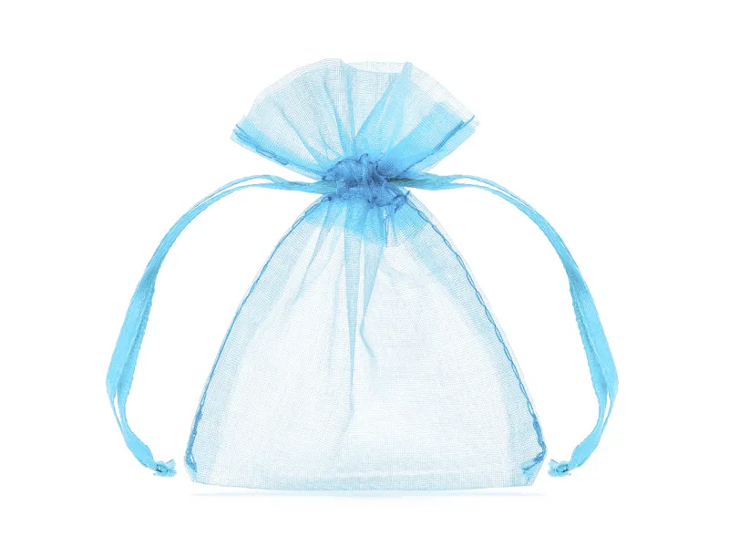 Pungi cu șnur din organza netedă, albastru deschis, cu dimensiunile de aproximativ 7,5 x 10 cm. Perfecte pentru invitații la nuntă.