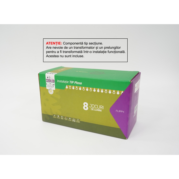 Sectiune Instalatie de Craciun Flippy, Tip Plasa, 320 LED-uri, 3 m x 3 m, 8 jocuri de lumini, Interconectabila, Fir transparent, Alb cald