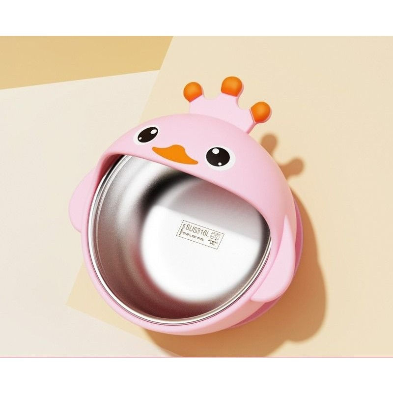 Set Diversificare pentru Bebelusi și Copii Flippy, 3 Piese, Model Ratusca– Bol, Lingură și Furculiță, Silicon și Oțel Inoxidabil, Roz