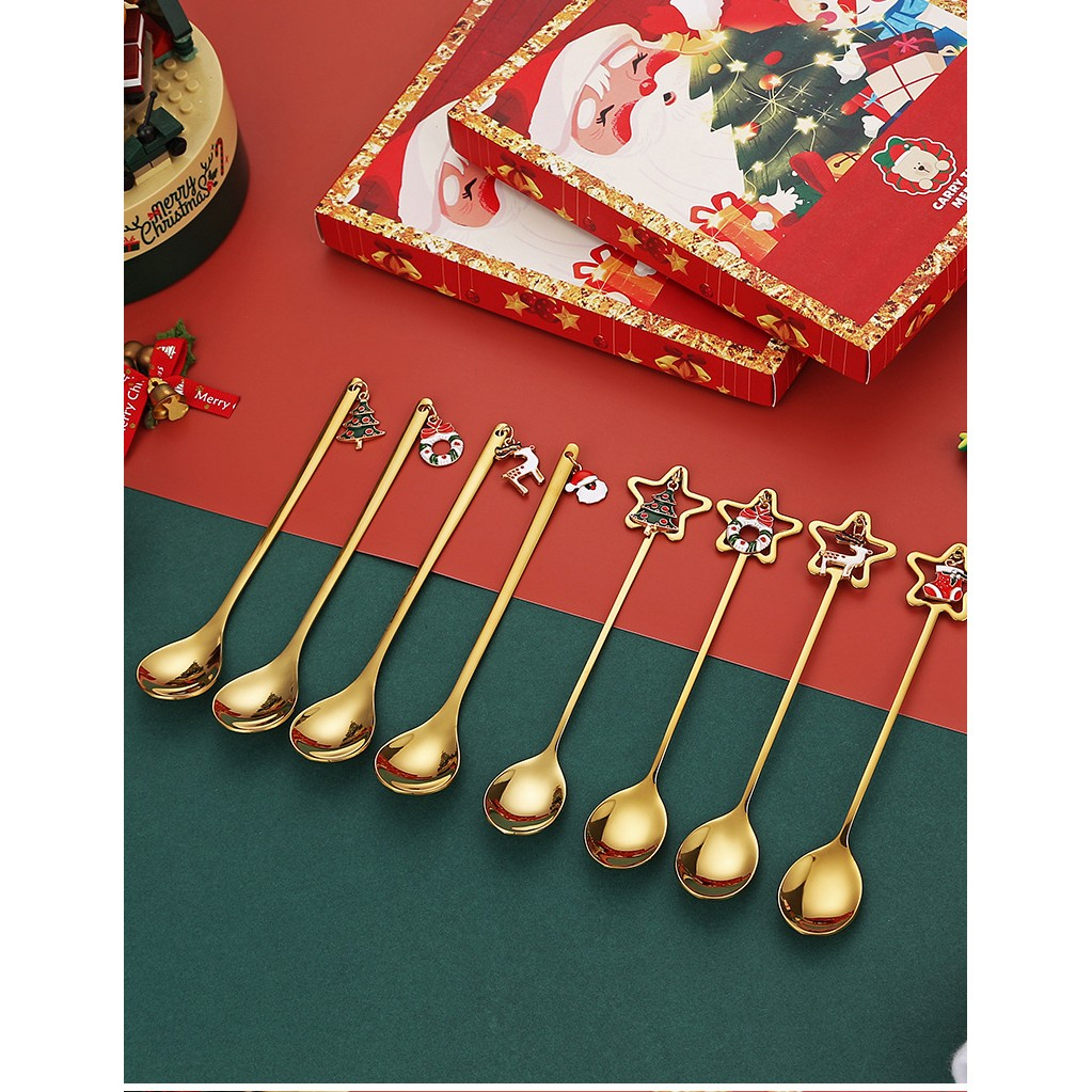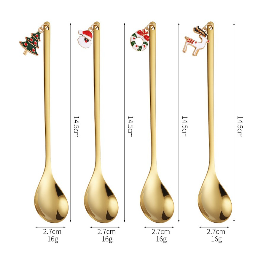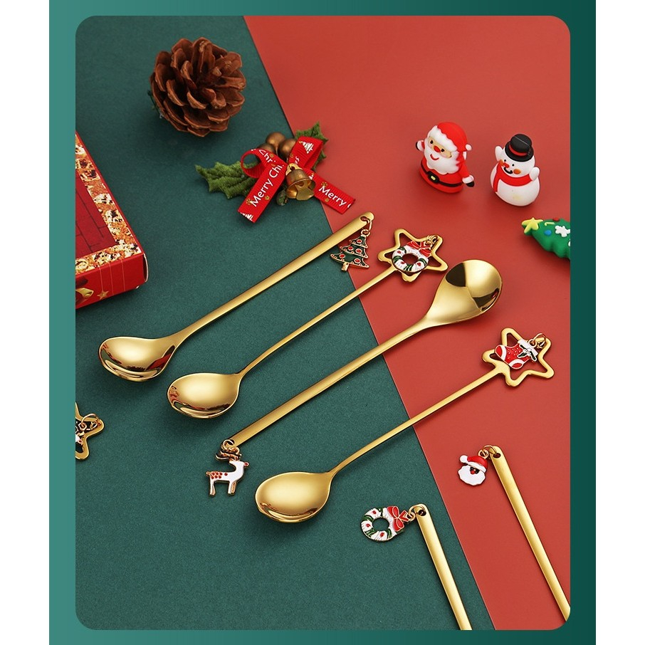 Set 4 Lingurițe Flippy – Tematică Crăciun „Carry The Merry” | Modele Pandantiv | Oțel Inoxidabil 430 | Auriu & Multicolor | Cutie Cadou, 19 x 16 x 2 cm