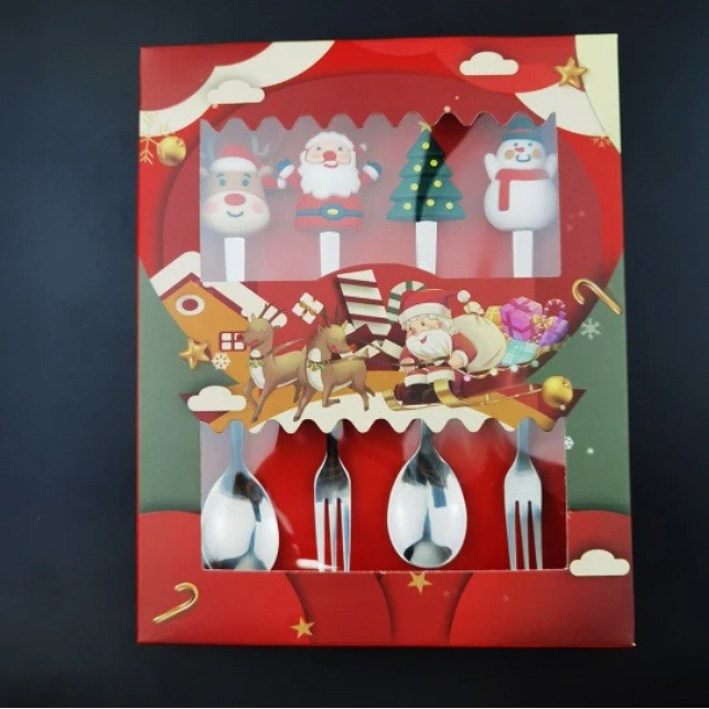 Set 4 Tacâmuri, Flippy, cu Figurine de Crăciun, din Oțel Inoxidabil, 2 Furculițe, 2 Linguri, Cutie Festivă, 13.5 cm, Roșu