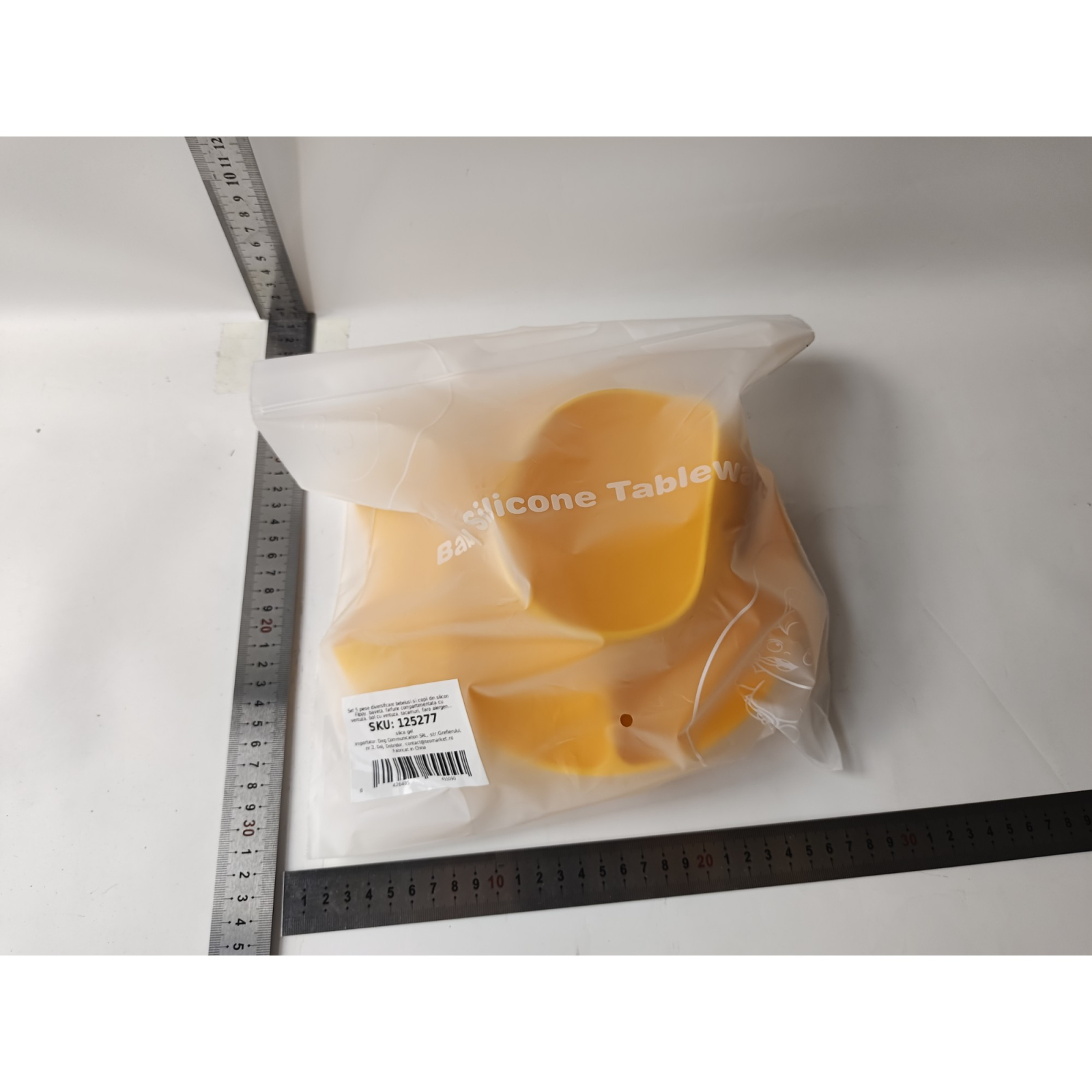 Set 5 piese diversificare bebelusi si copii din silicon Flippy, baveta, farfurie compartimentata cu ventuza, bol cu ventuza, tacamuri, fara alergeni, galben