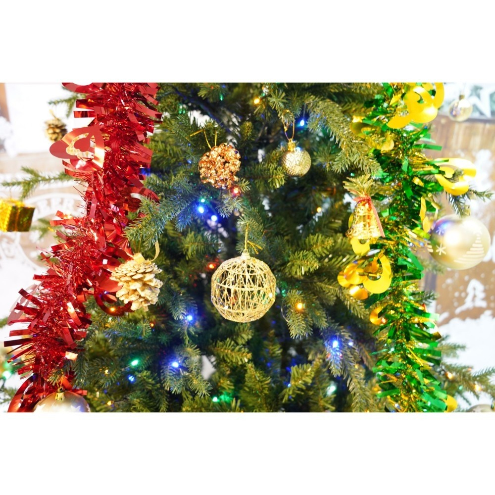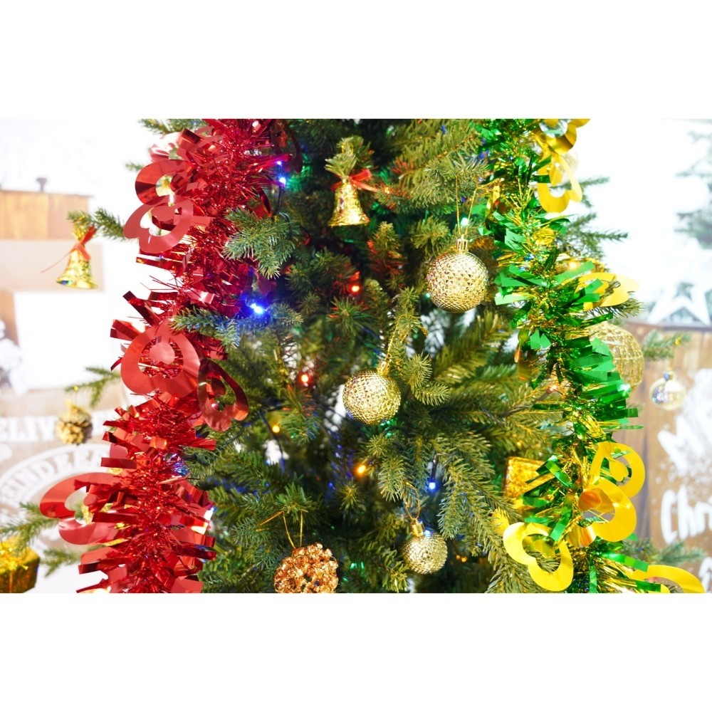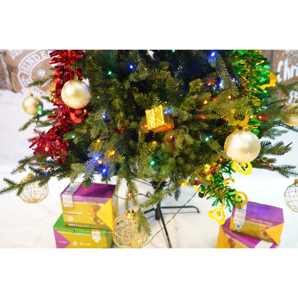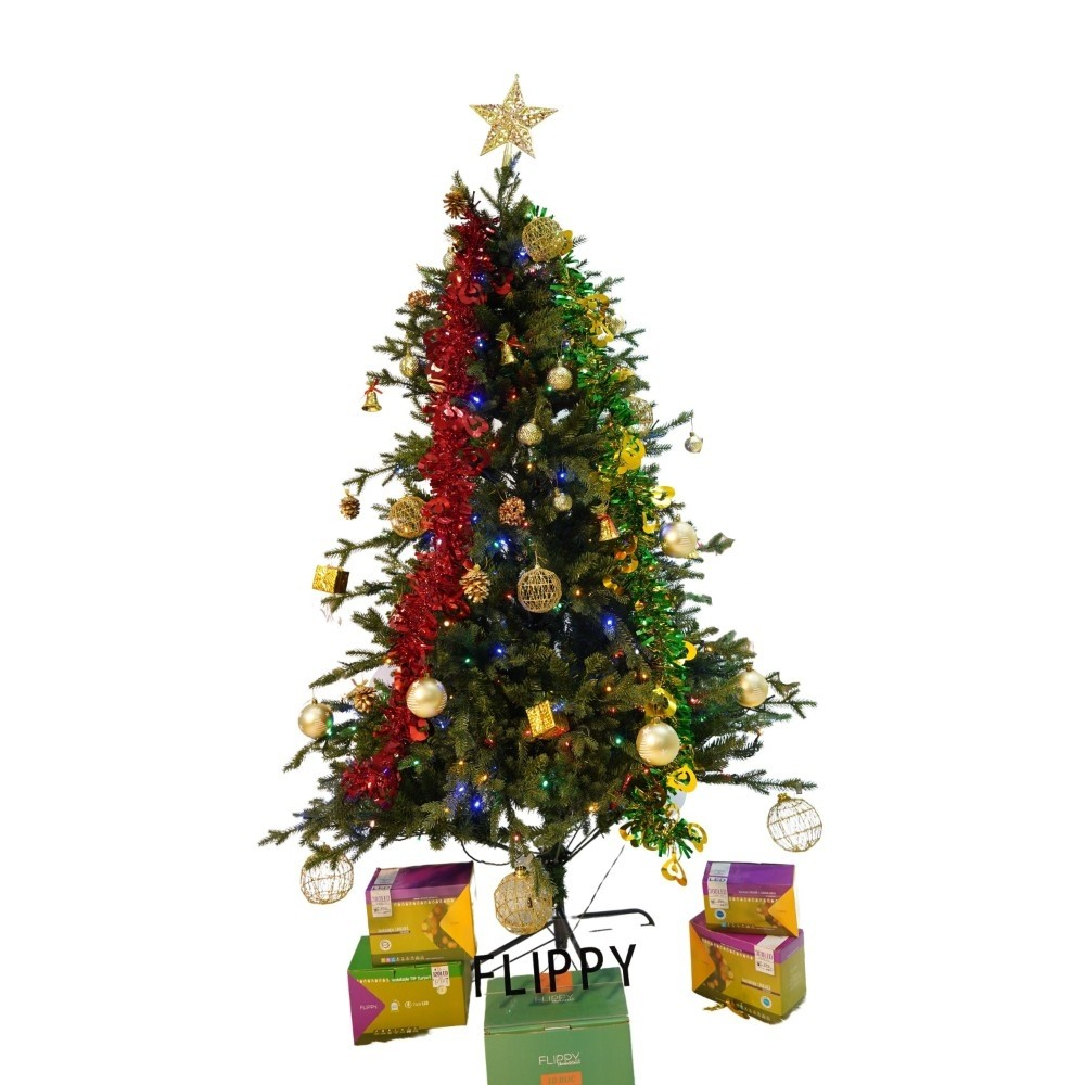 Set brad artificial de Craciun si elemente decorative, Becuri led incluse in ramuri, pentru interior/exterior, inaltime 180 cm, diametru 128 cm, 1246 ramuri, Flippy, verde, suport metalic inclus