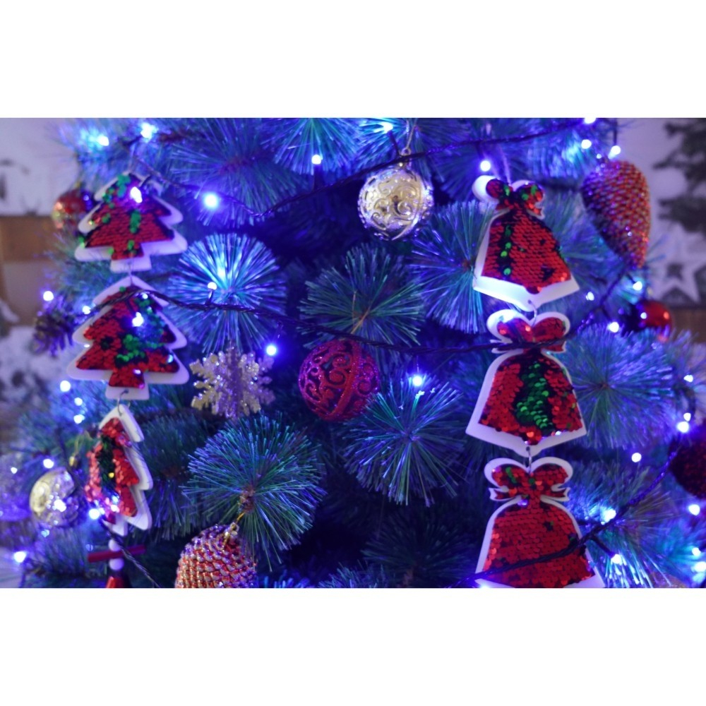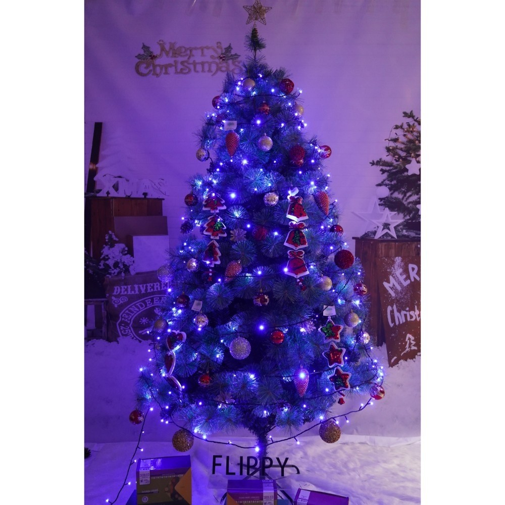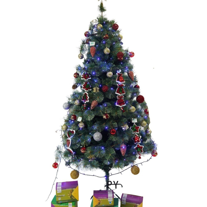 Set brad artificial de Craciun si elemente decorative, Becuri led incluse in ramuri, pentru interior/exterior, inaltime 180 cm, diametru 128 cm, 1246 ramuri, Flippy, verde, suport metalic inclus