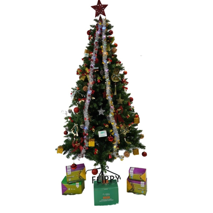 Set brad artificial de Craciun si elemente decorative, nins, decorat cu conuri pin, pentru interior/exterior, inaltime 210 cm, diametru 131 cm, 630 ramuri, Flippy, alb/verde, suport metalic inclus