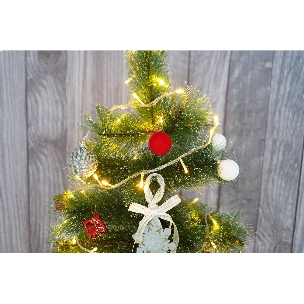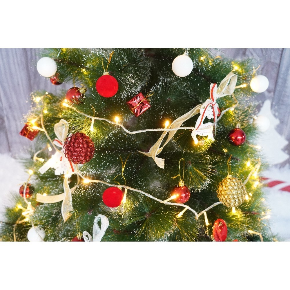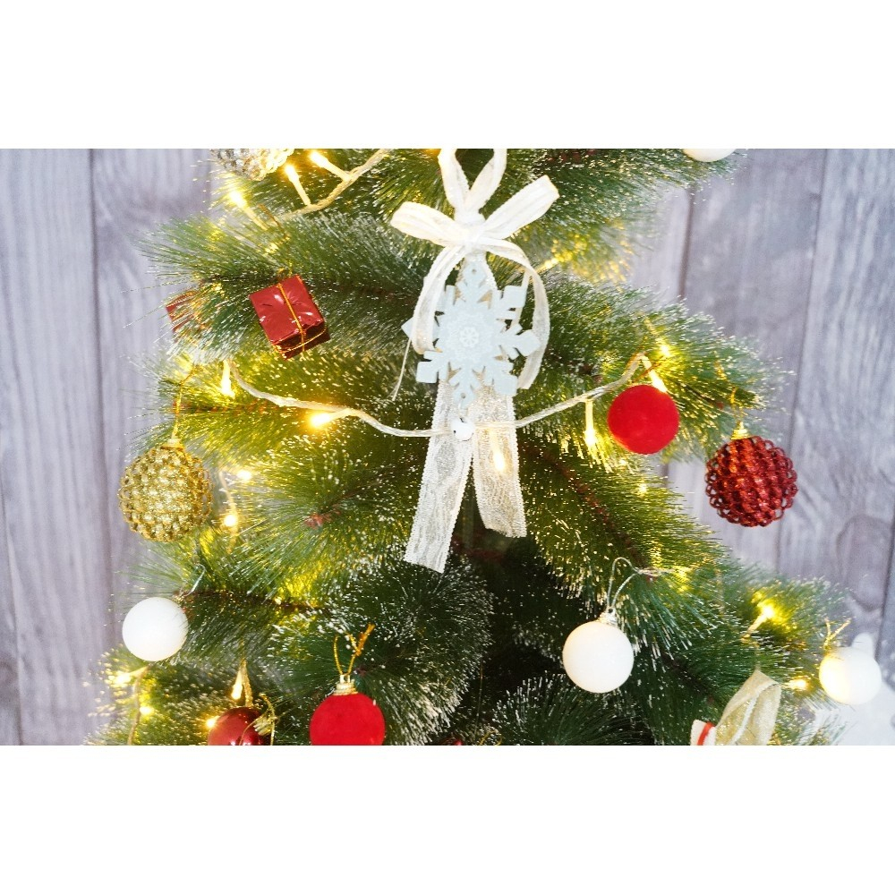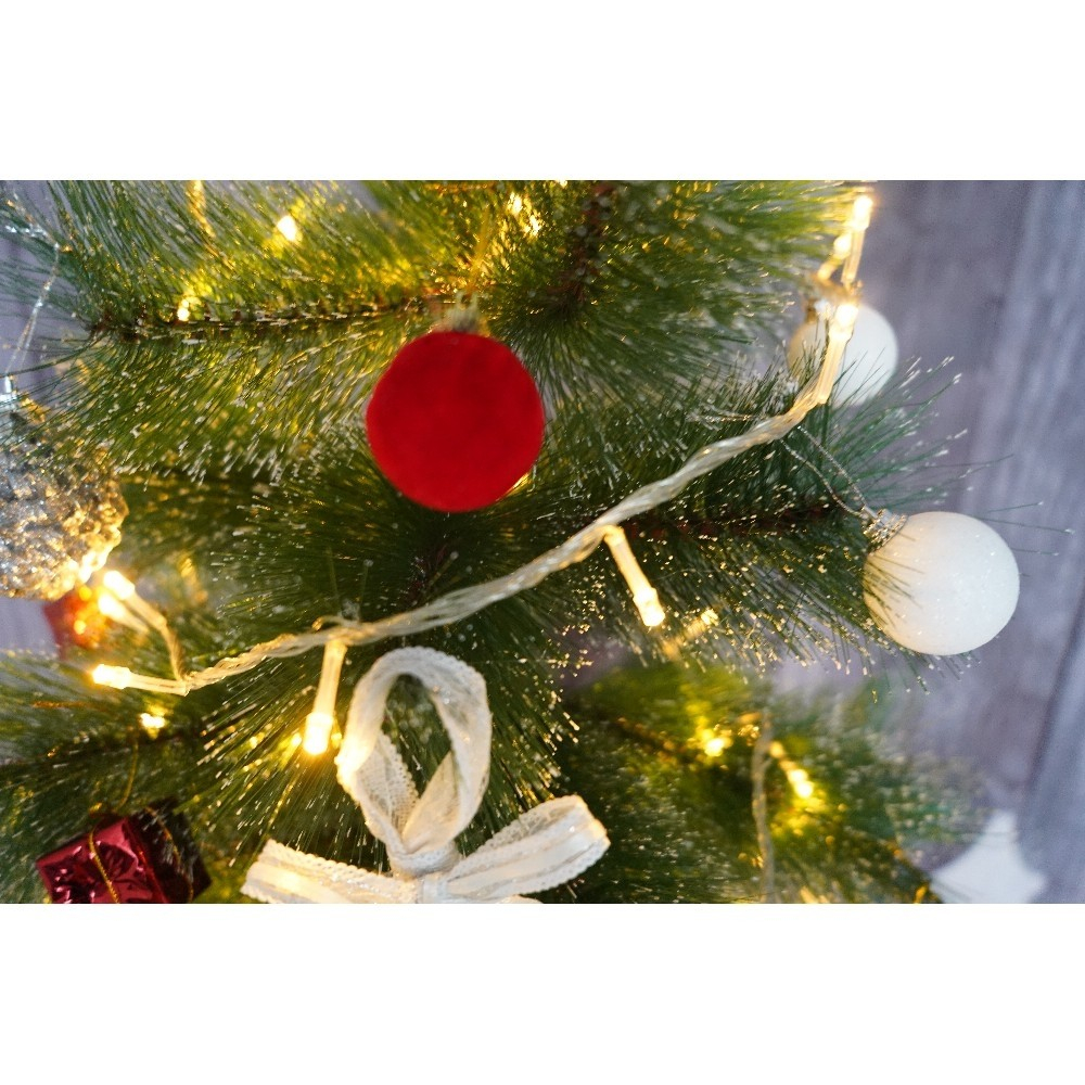 Set brad artificial de Craciun si elemente decorative tip pin inzapezit tip 2, inaltime 150 cm, diametru 85 cm, 160 ramuri cu ace 3D 12 cm, Flippy, verde cu varfuri, ninse, suport metalic inclus
