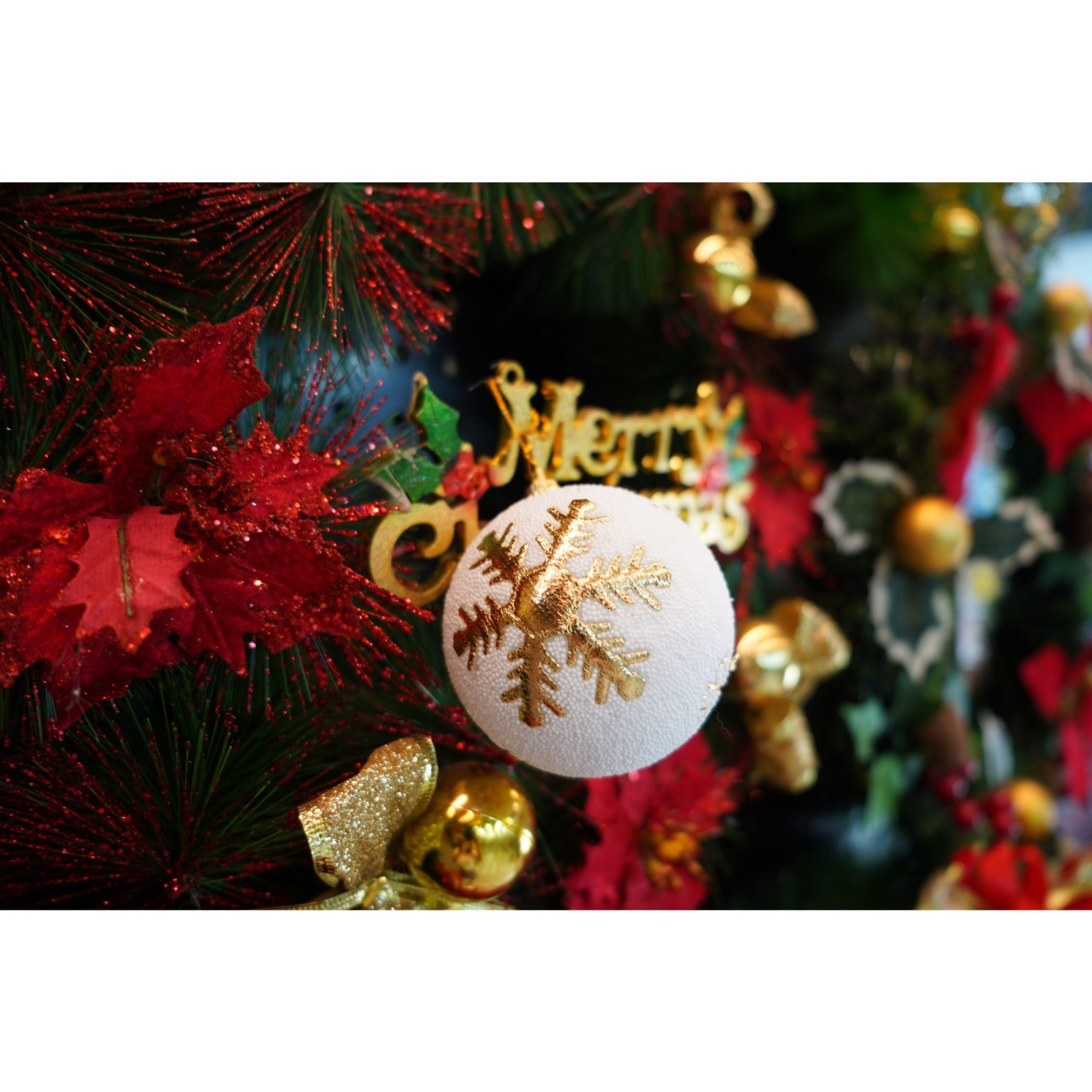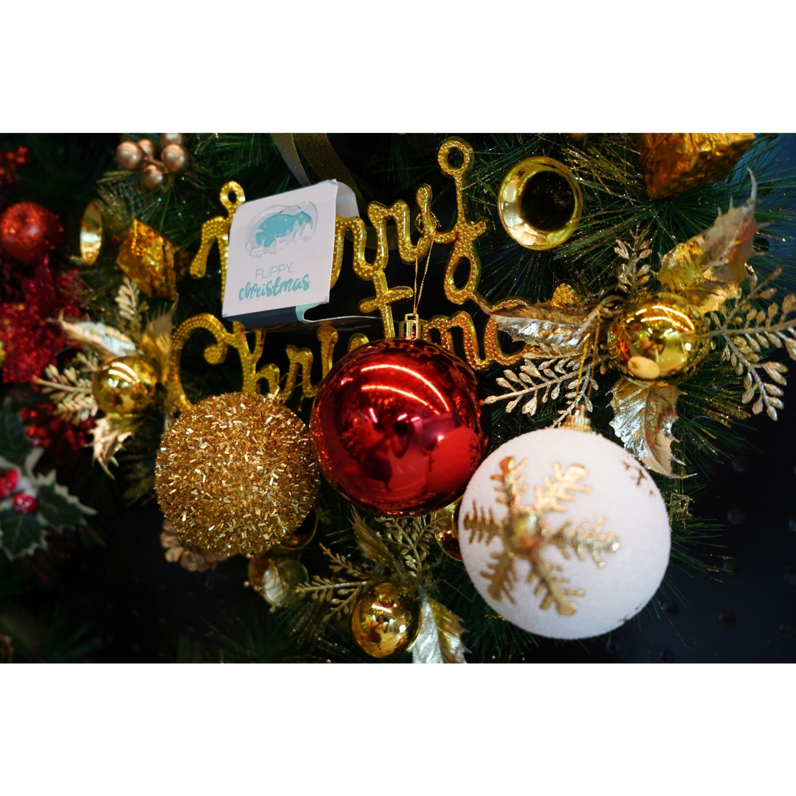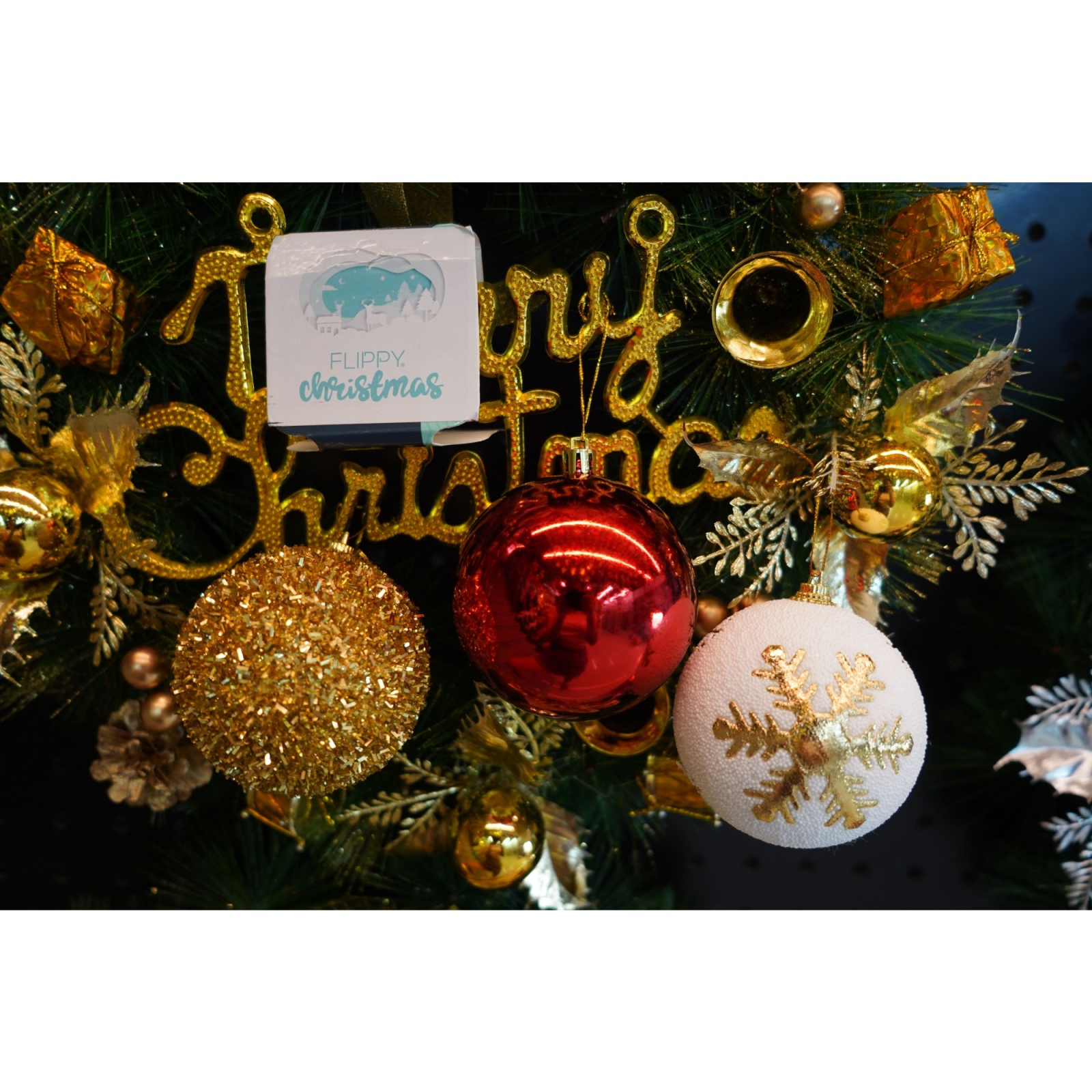 Set de 12 ornamente de brad, Flippy, de tip Glob, Alb/ Rosu, din polistiren, cu finisaj sclipitor , cutie 8 cm adancime x 32 cm lungime x 24 cm inaltime