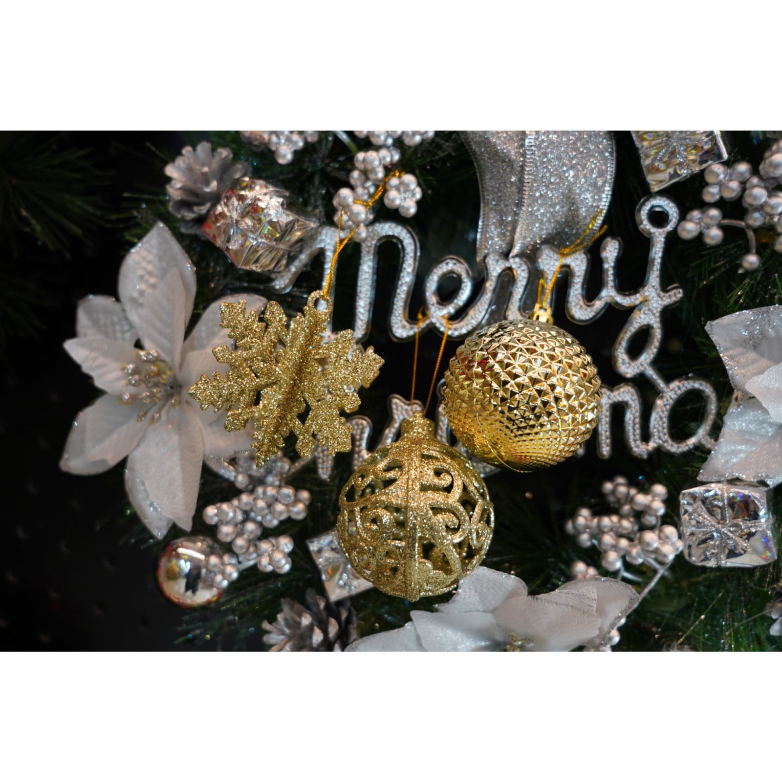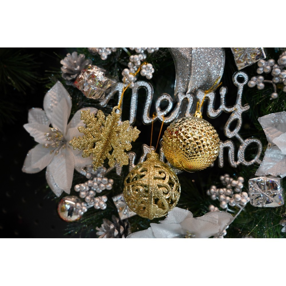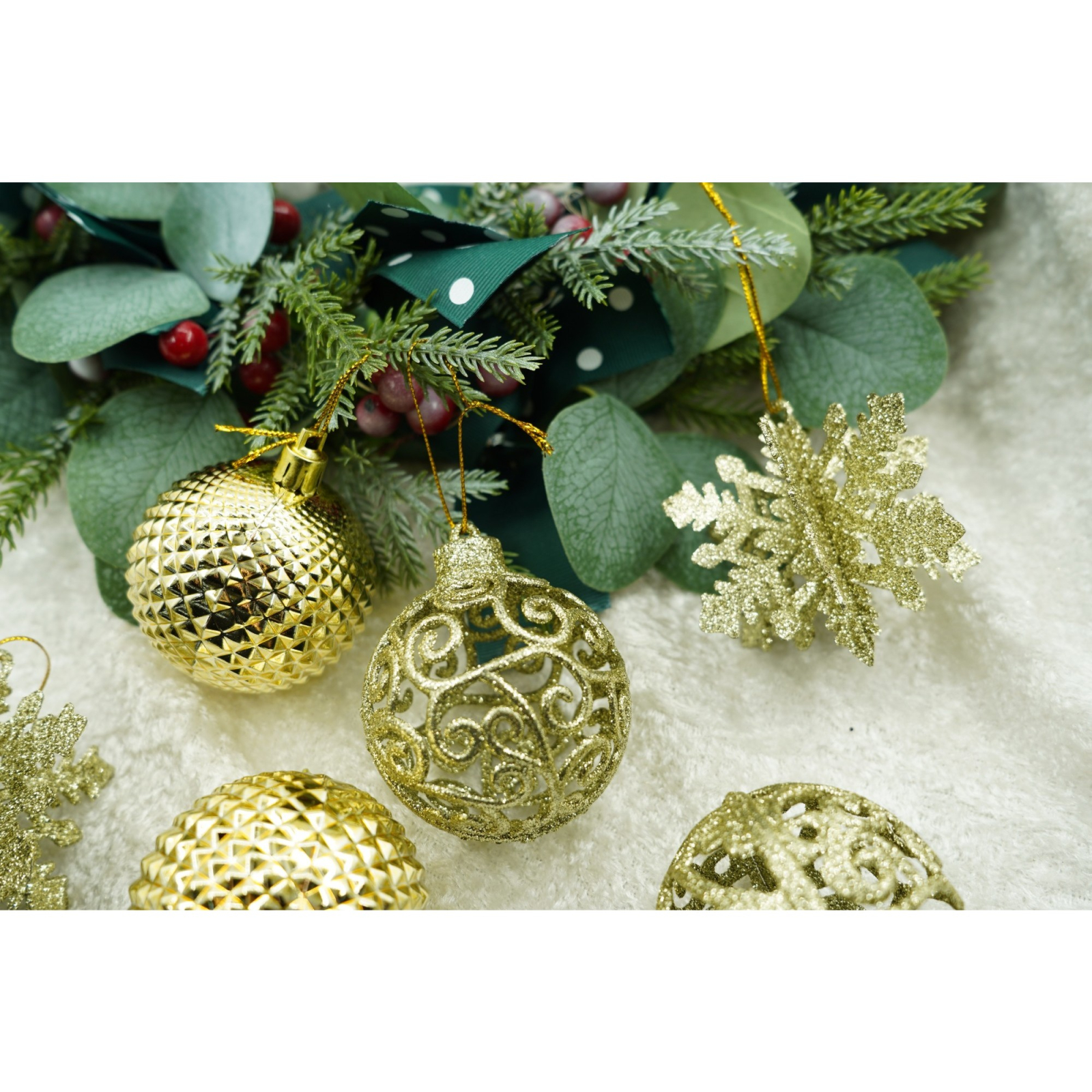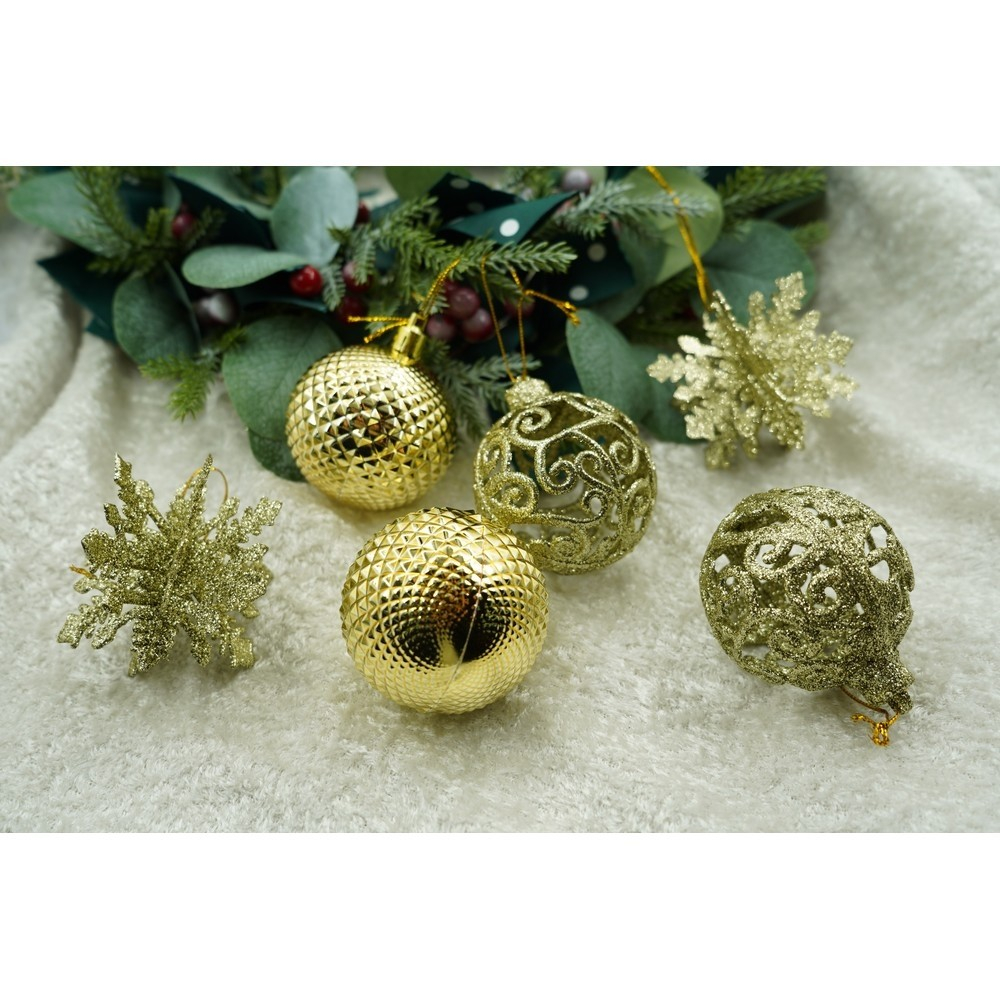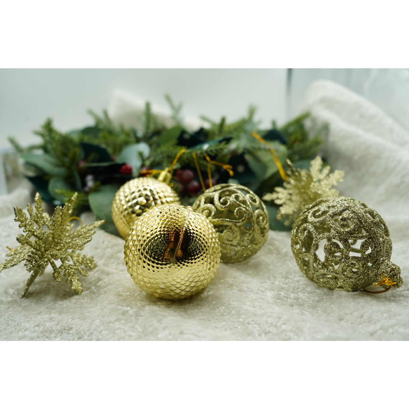 Set de 12 ornamente de brad, Flippy, de tip Glob, Auriu, din plastic, cu finisaj sclipitor , cutie 6 cm adancime x 23 cm lungime x 18 cm inaltime