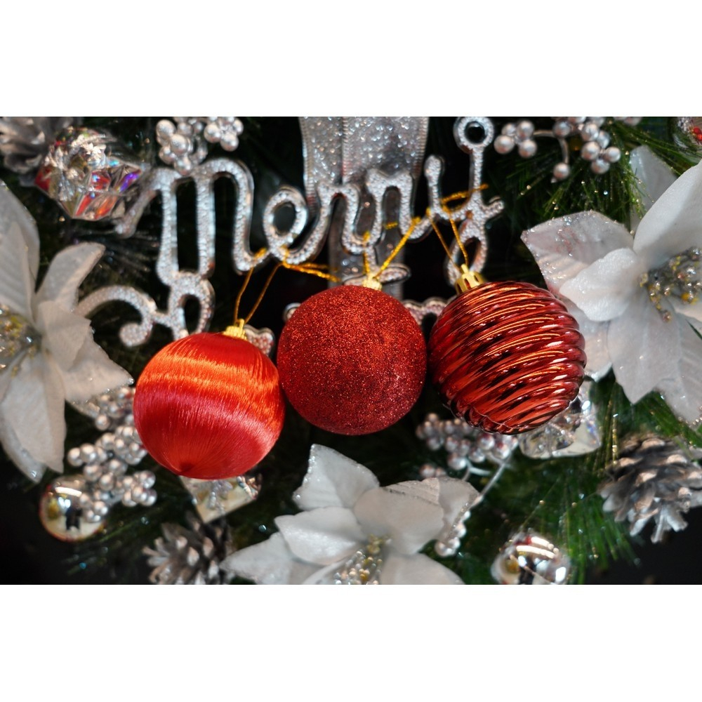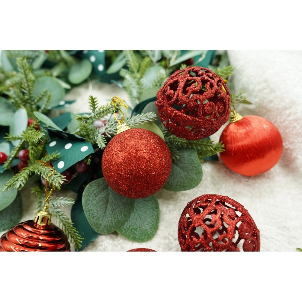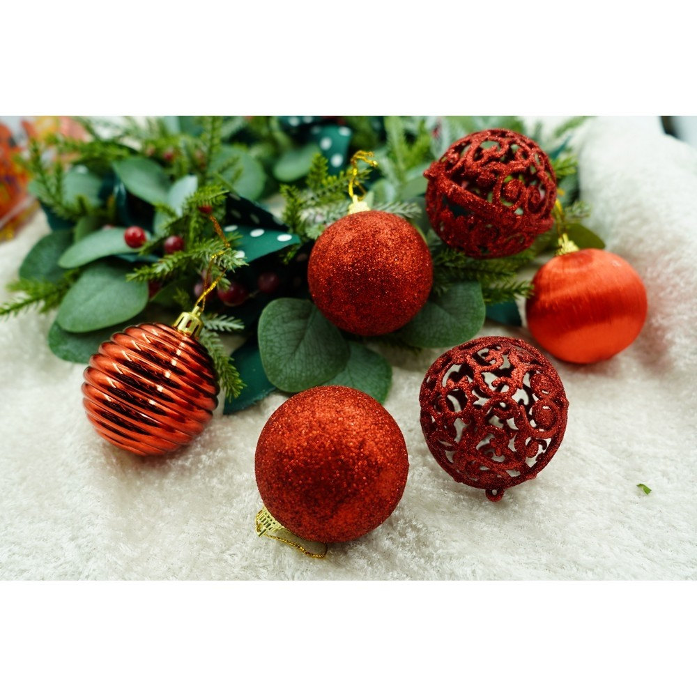 Set de 12 ornamente de brad, Flippy, de tip Glob, Rosu, din polistiren, cu finisaj sclipitor , cutie 6 cm adancime x 23 cm lungime x 18 cm inaltime