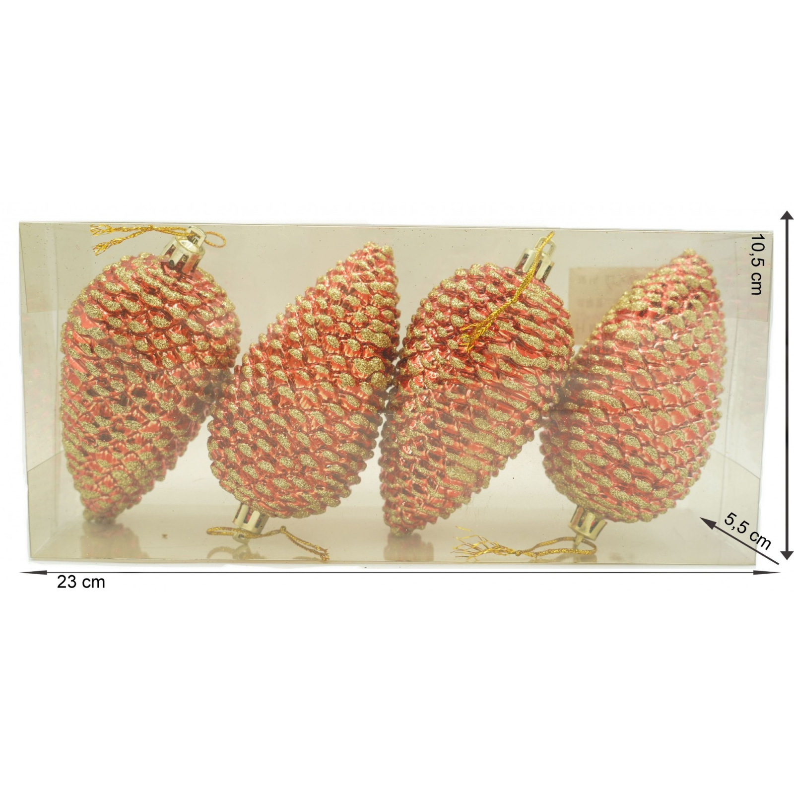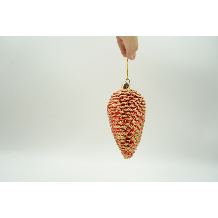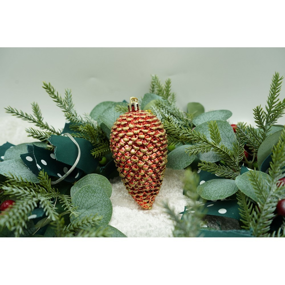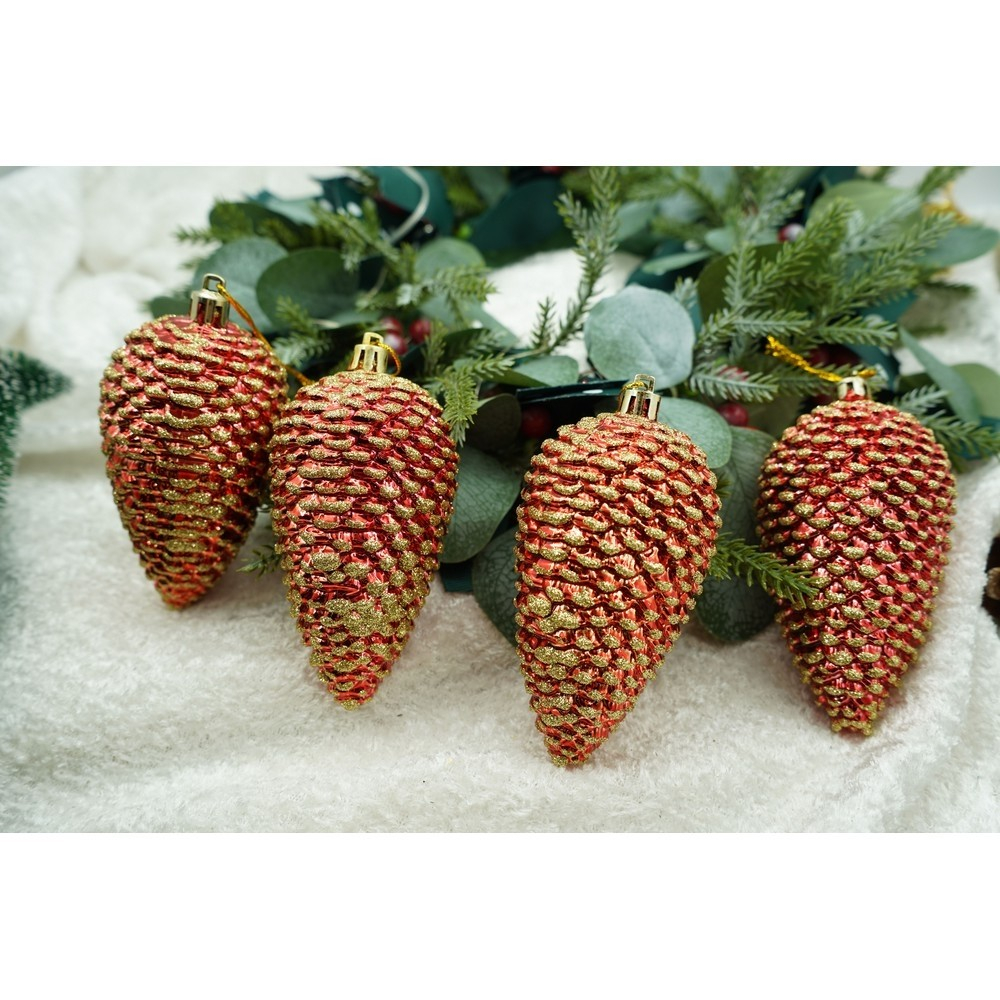 Set de 4 ornamente de brad, Flippy, de tip Con de brad, Rosu, cu ø de 5.5cm, din plastic, cu finisaj sclipitor , cutie 23 cm lungime x 10.5 cm inaltime x 5.5 cm adancime