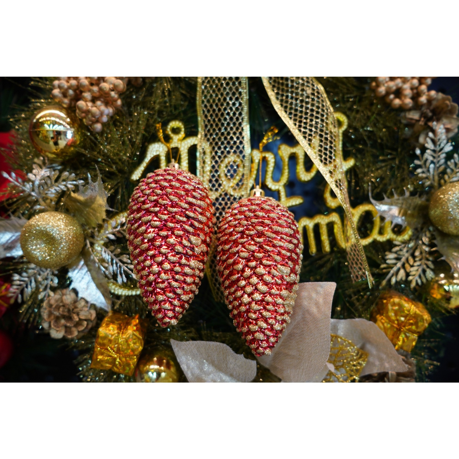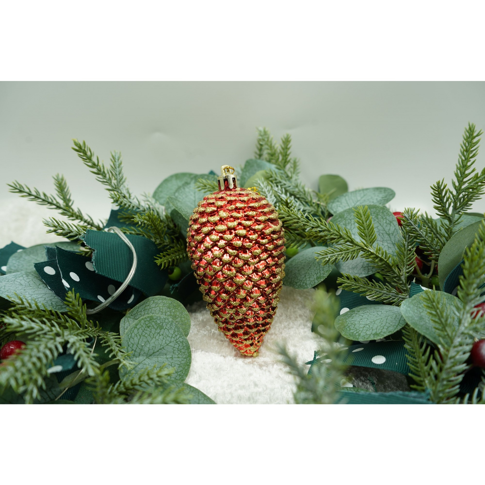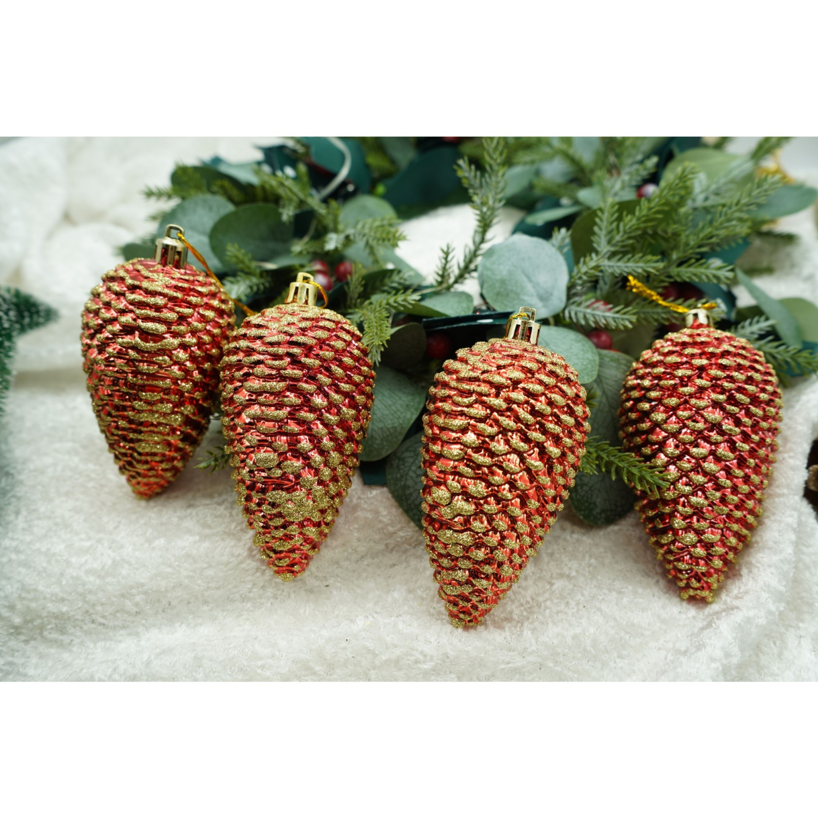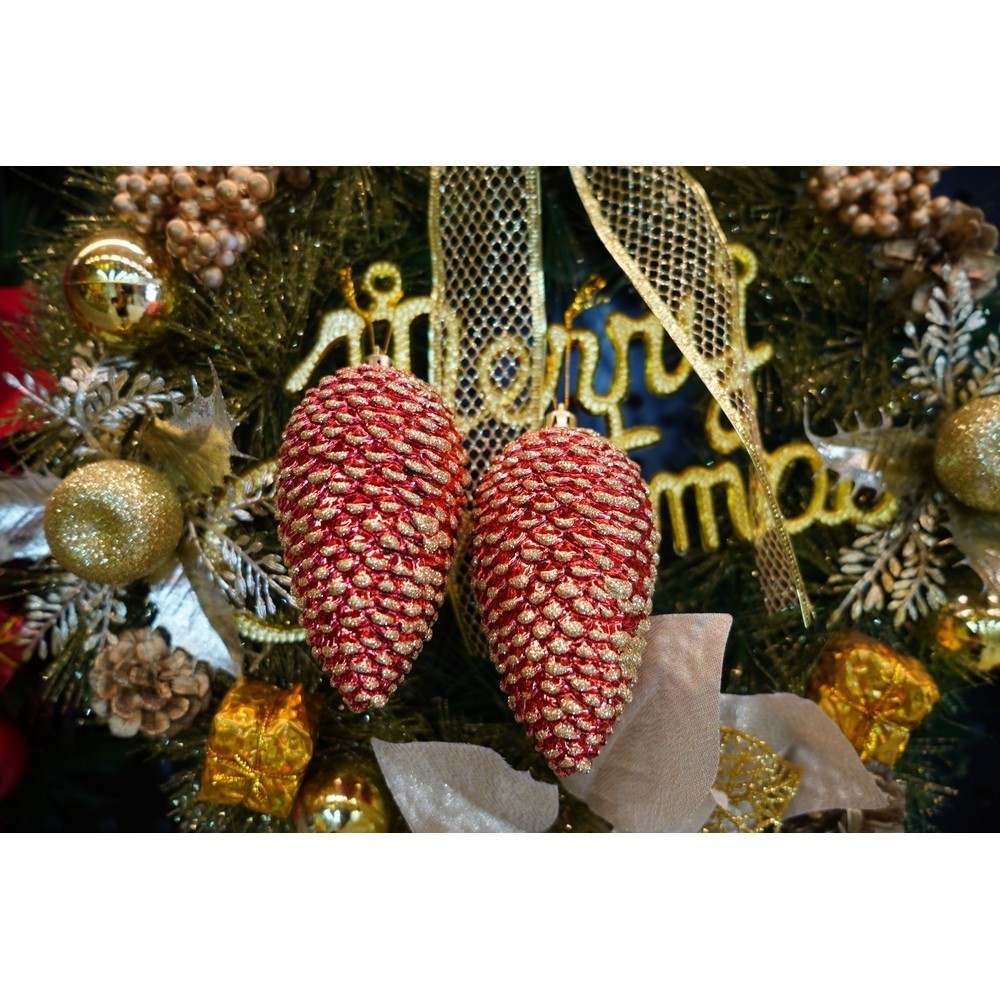 Set de 4 ornamente de brad, Flippy, de tip Con de brad, Rosu, cu ø de 5.5cm, din plastic, cu finisaj sclipitor , cutie 23 cm lungime x 10.5 cm inaltime x 5.5 cm adancime
